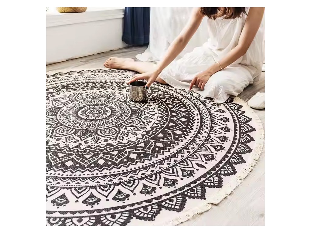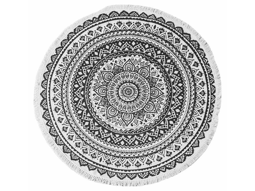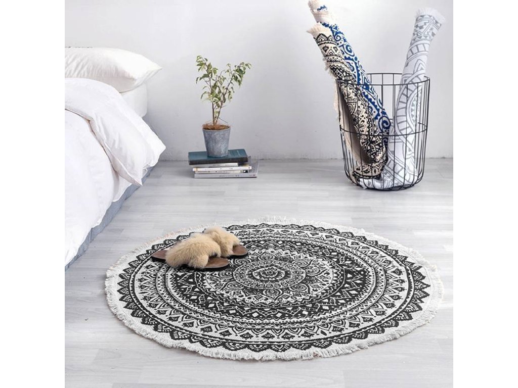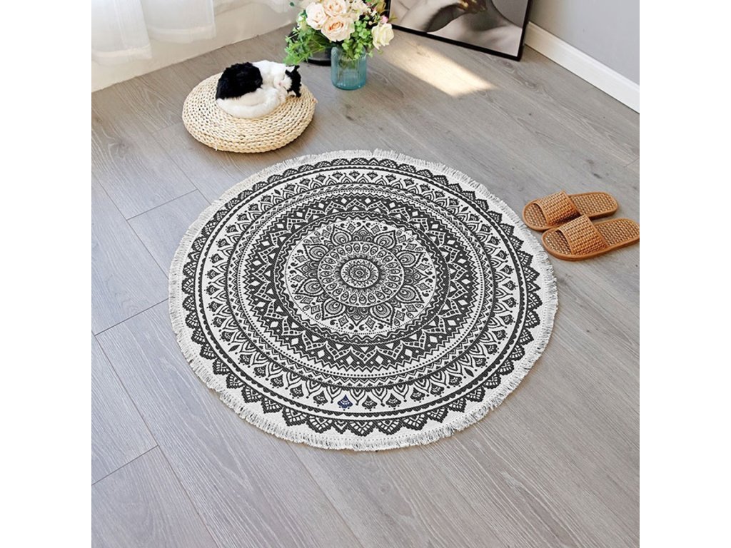 Kulatý dekorativní koberec v boho stylu. Vyroben z příjemného materiálu na dotek. Estetické třásně na okrajích koberce. Bude se perfektně hodit jako koberec do obývacího pokoje nebo do chodby, kde prohřeje interiér.