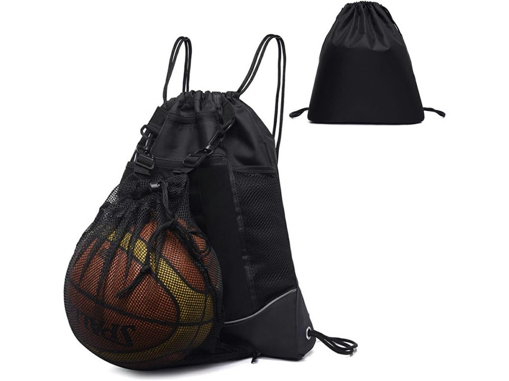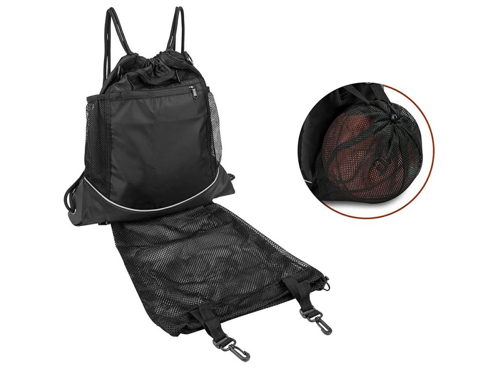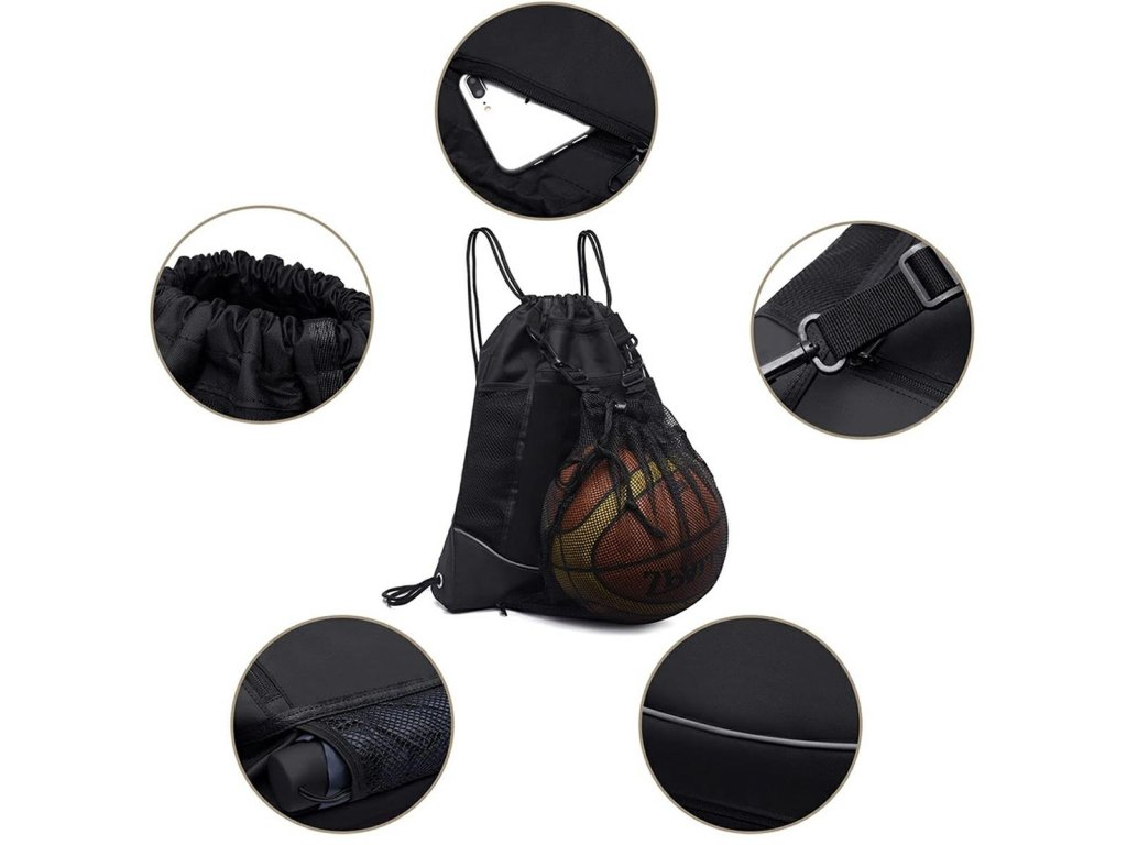 Funkční skládací sportovní taška se zapínáním na stahovací šňůrku. Lze ji použít jako klasický batoh s prostornou hlavní přihrádkou. Vybavena několika přihrádkami (včetně jedné na zip). Velká síťovaná kapsa usnadňuje uložení míče. Vyrobena z odolného materiálu, odolného proti opotřebení a nepříznivým povětrnostním podmínkám.