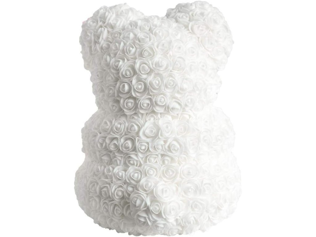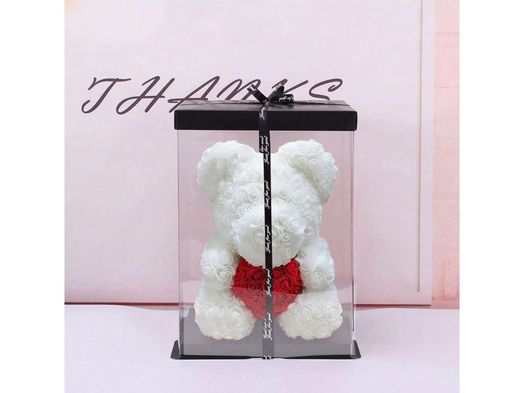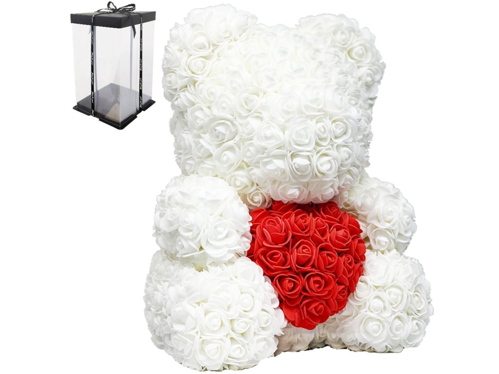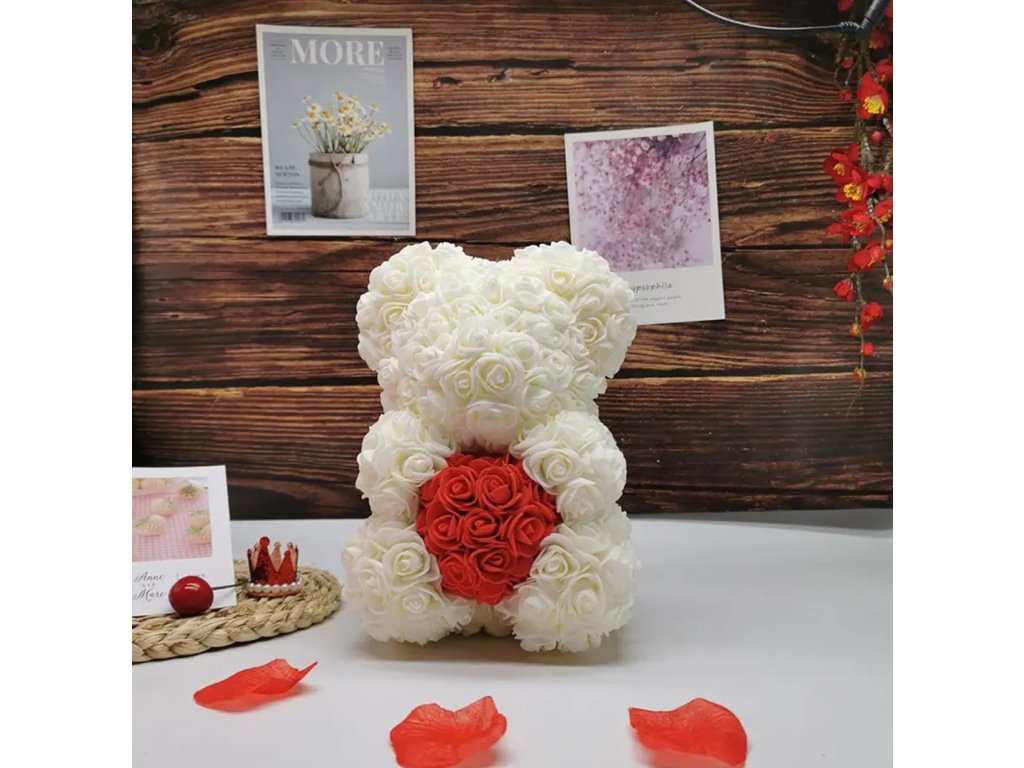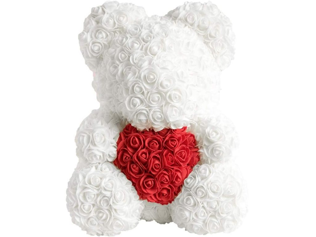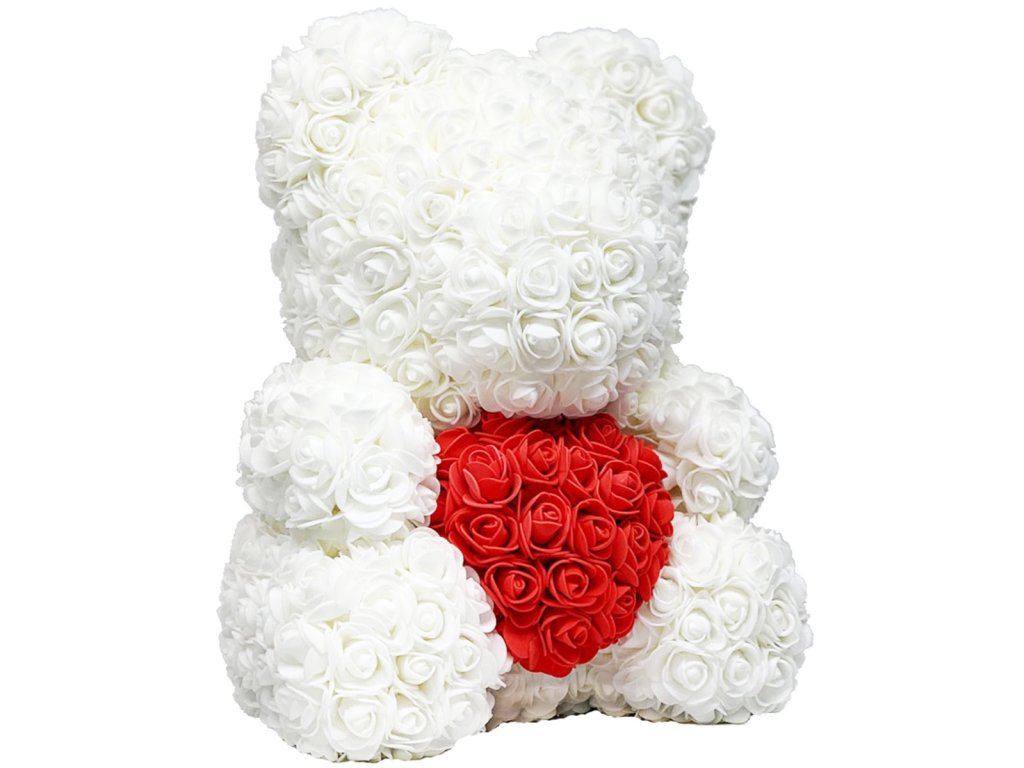 Medvídek z bílých růží držící červené srdce. Perfektní nápad na dárek k Valentýnu nebo netradiční dárek.
