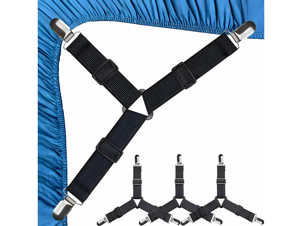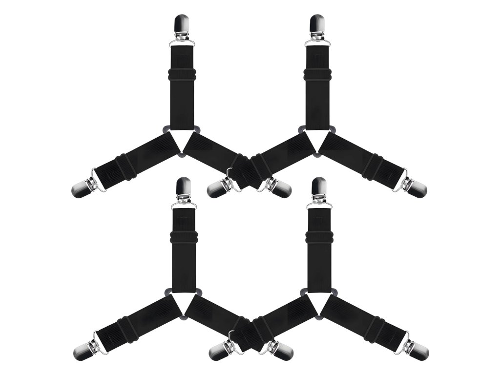 Sada čtyř napínacích popruhů pro prostěradla. Díky nastavitelné délce se snadno přizpůsobí šířce matrace. Pevné klipy účinně drží prostěradlo na místě a zabraňují jeho sklouznutí z postele.