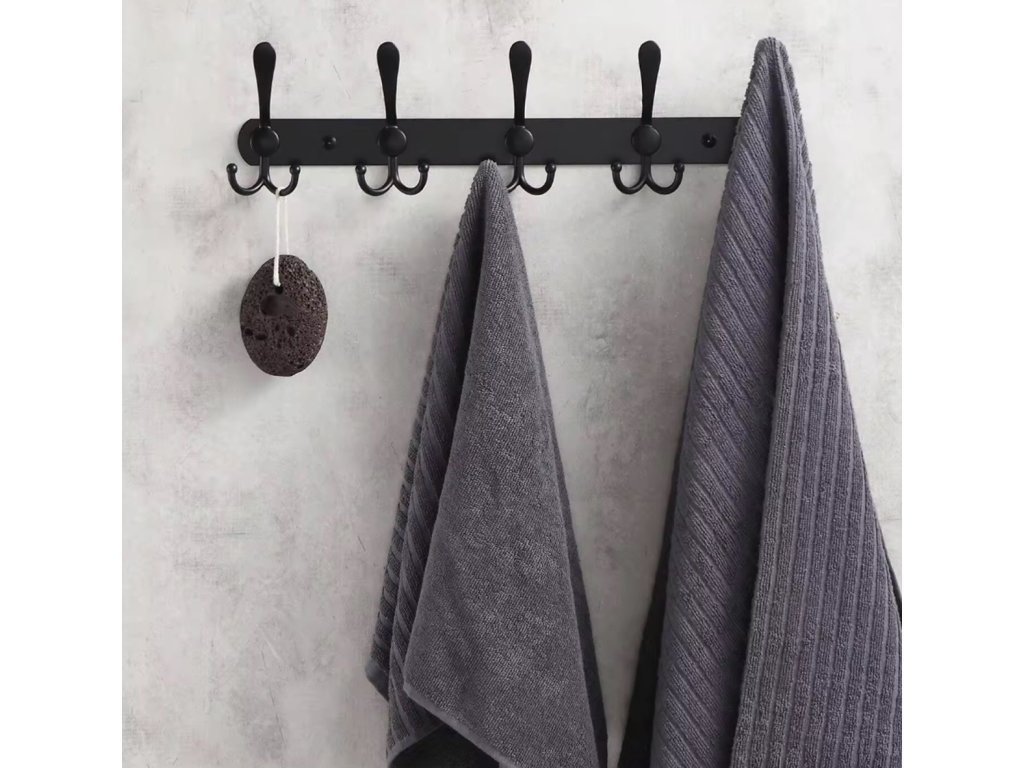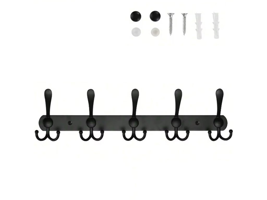 Klasický černý věšák do předsíně s 15 háčky. Vyrobeno z masivní nerezové oceli s práškovým nástřikem. Je perfektní jako doplněk do předsíně, který vám umožní pověsit kabáty nebo bundy. Díky univerzálnímu designu se věšák hodí do každé místnosti. Snadná instalace pomocí přiložených šroubů a hmoždinek.