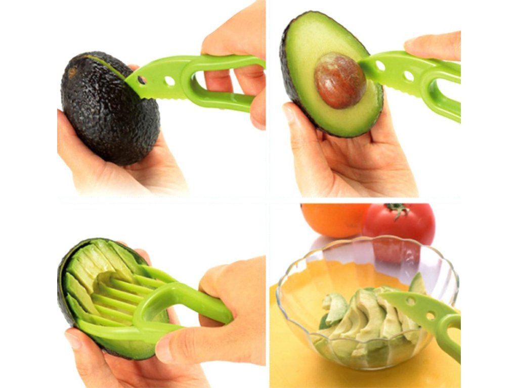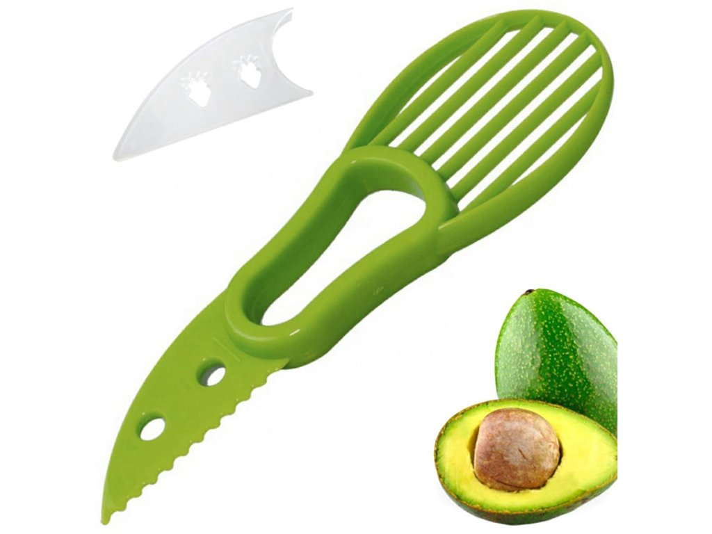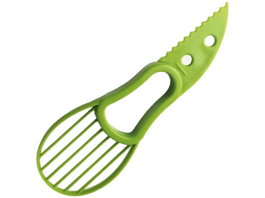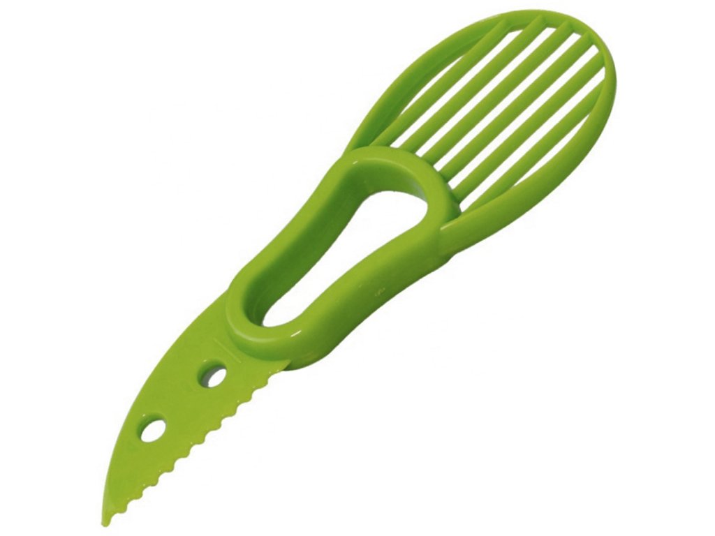 Kompaktní nůž na avokádo a jádro z pevného plastu. Díky tomu je řezání ovoce a odstraňování semen mnohem jednodušší. Druhá strana umožňuje rychle vydlabat dužinu zevnitř. Pevná konstrukce zajišťuje dlouhé a bezproblémové používání výrobku. Pohodlná, zaoblená rukojeť usnadňuje řezání a zabraňuje zranění.