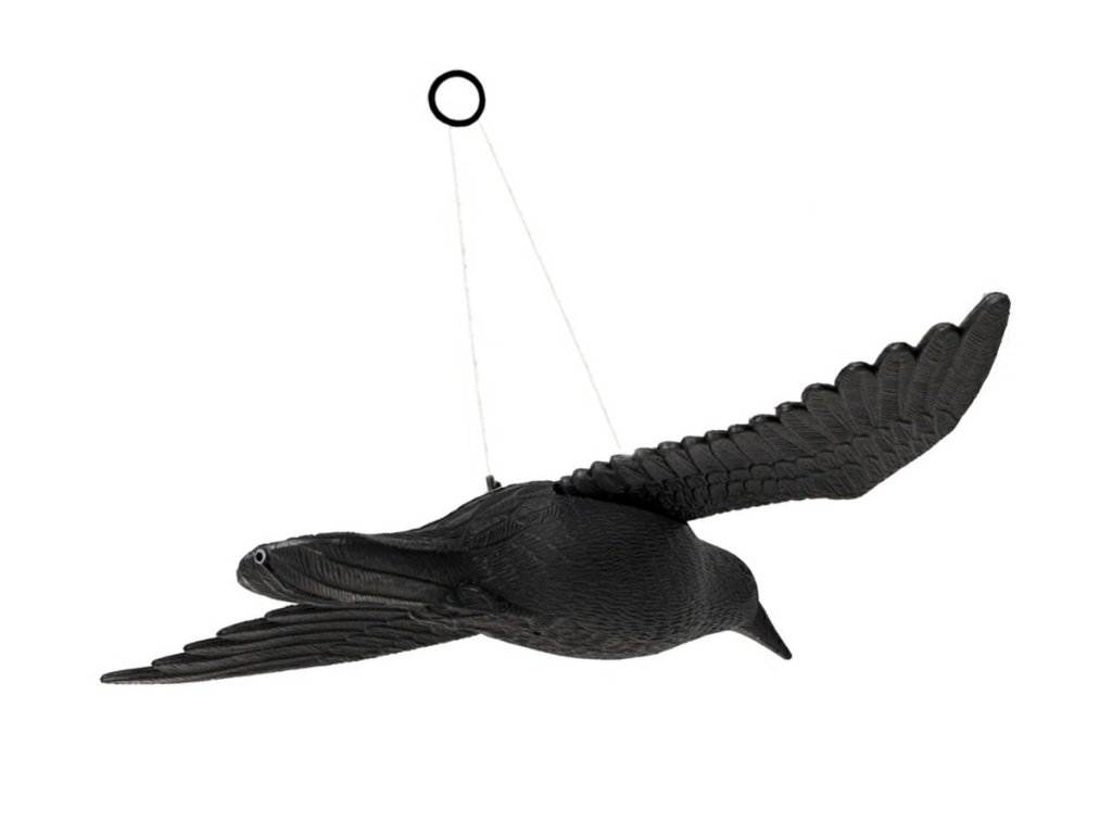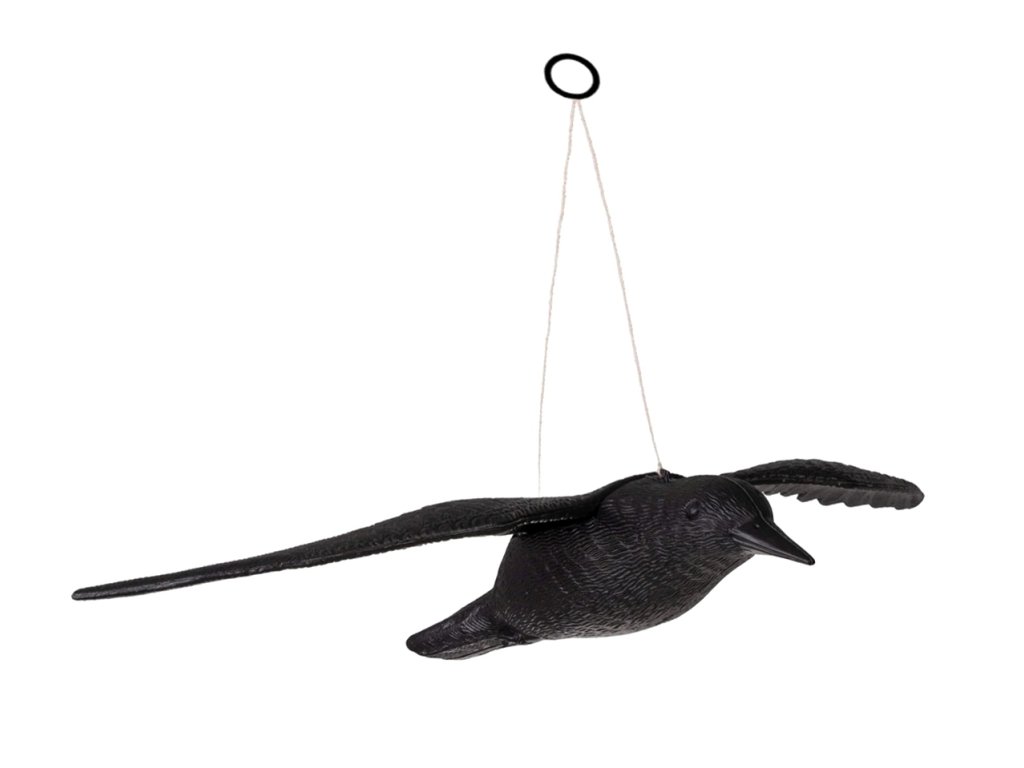 Realistický havran v životní velikosti za letu. Vyroben z odolného plastu, je to extrémně účinný odpuzovač ptáků. Snadná instalace (šňůrka je součástí balení). Zbavte se otravných hostů ze zahrady nebo balkonu!