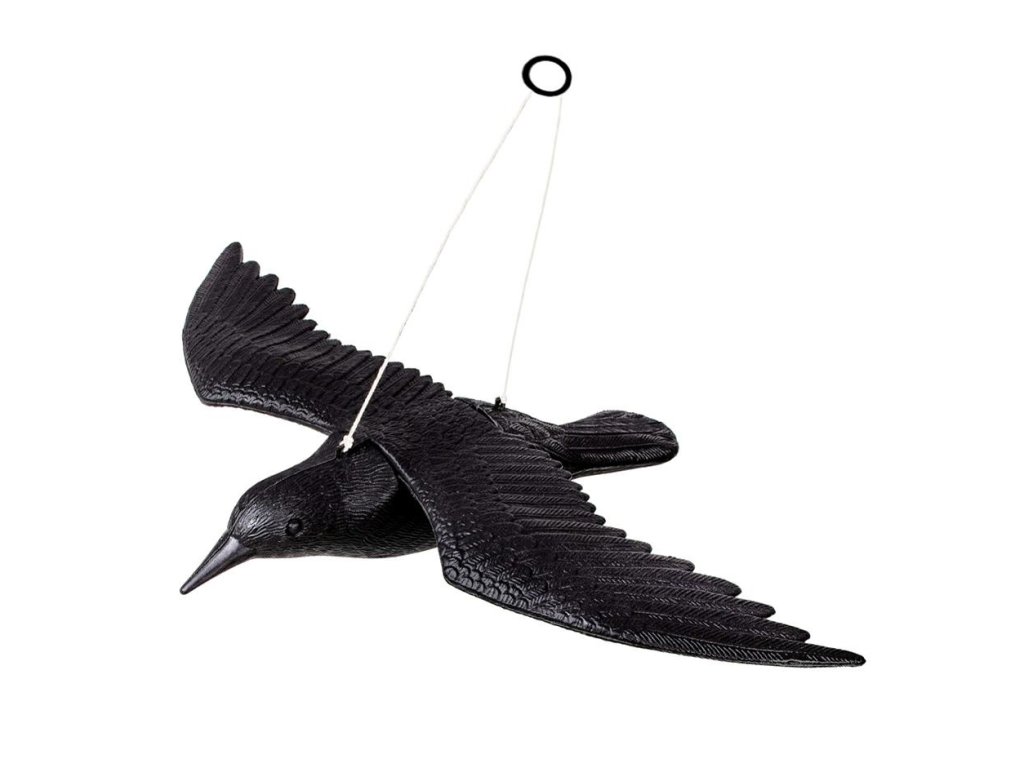 - Umělý havran s realistickým vzhledem a velikostí, který odpuzuje ptáky (holuby, špačky atd.) krmící se na pozemku nebo na zahradě.