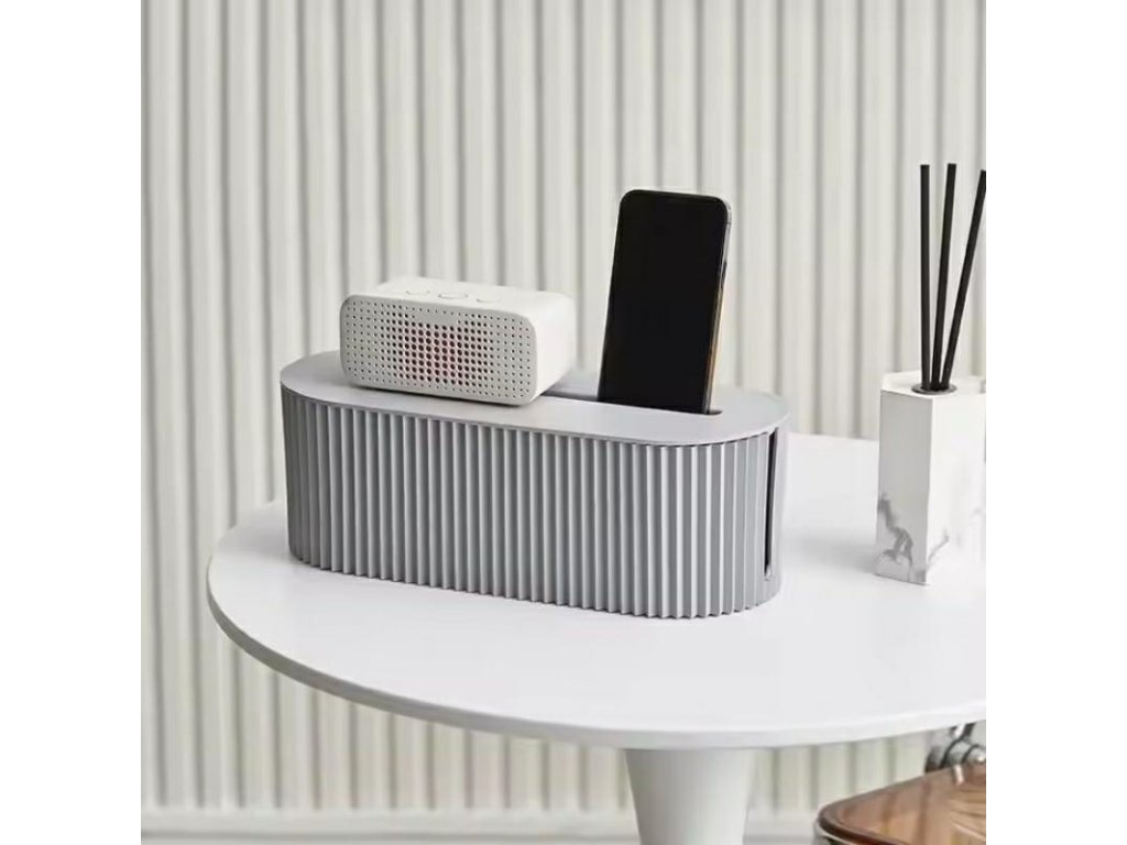 Tento praktický a elegantní organizér na kabely je perfektním řešením pro skrytí nevzhledných kabelů, prodlužovacích kabelů a nabíječek. Udrží váš stůl, obývací pokoj nebo pracovní prostor uklizený a čistý. Organizér chrání před prachem a nečistotami a speciální otvory usnadňují vedení kabelů libovolným směrem. Navíc je v horní části praktický výklenek – ideální místo pro odložení telefonu během nabíjení.