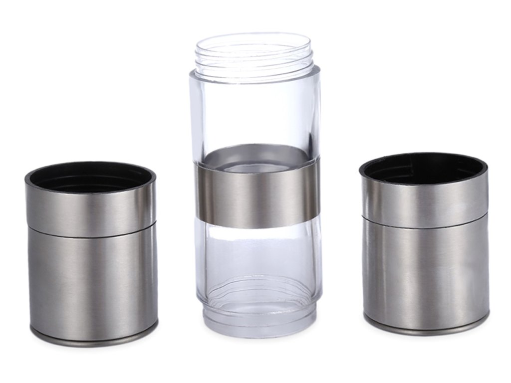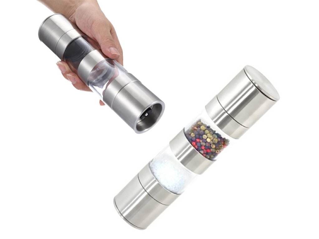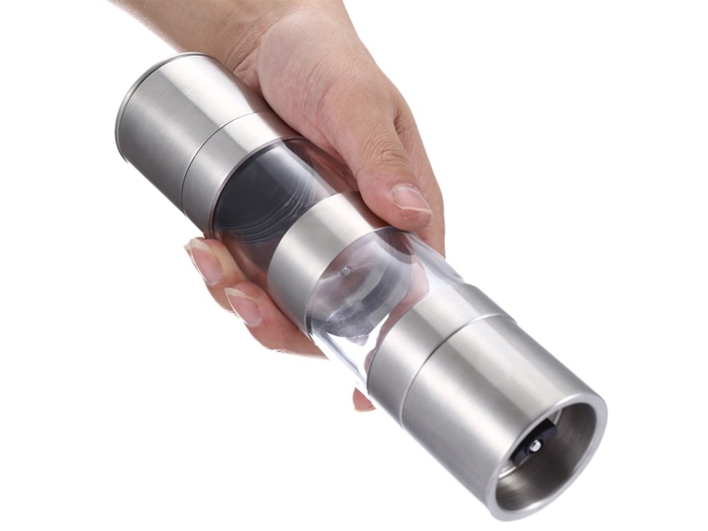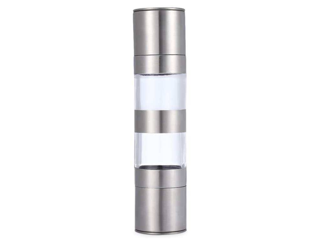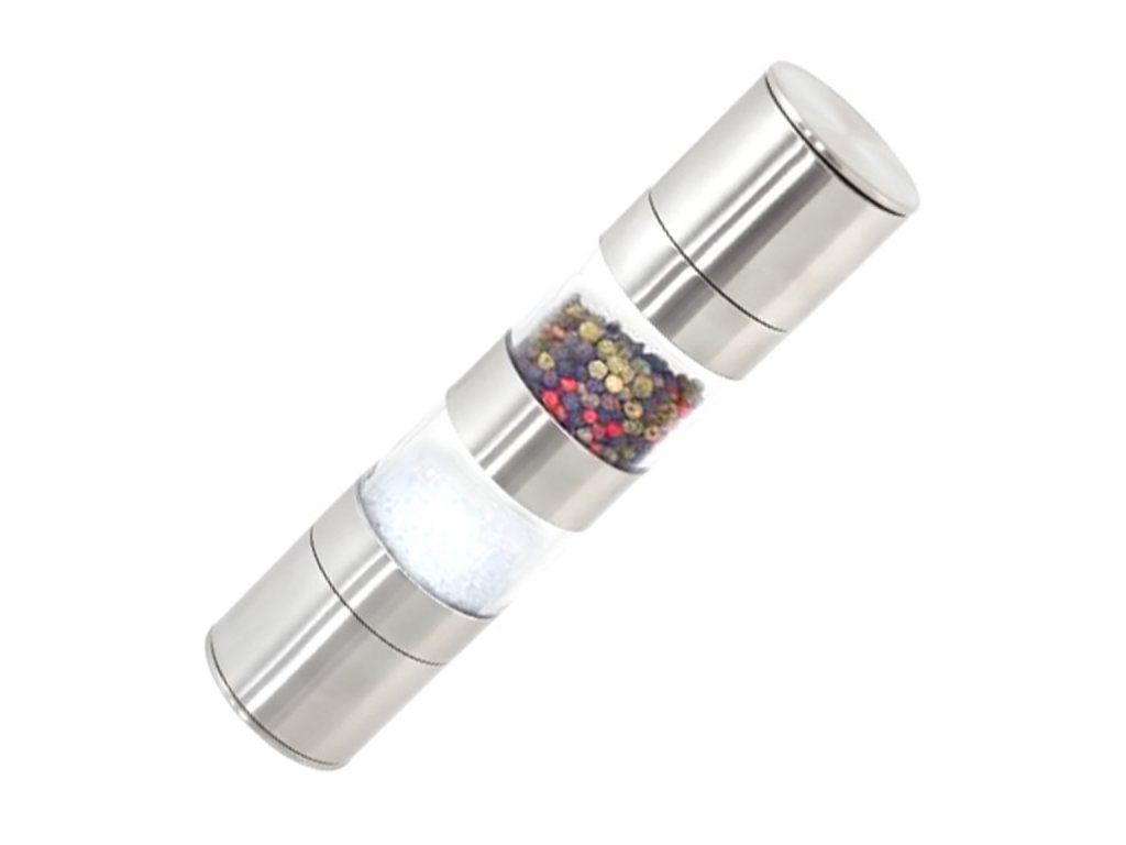 Ruční dvoukomorový mlýnek na sůl a pepř - nezbytný prvek každé kuchyně. Elegantní vzhled - mlecí mechanismy pokryté saténovým hliníkem a akrylová průhledná okénka poskytují pohled na obsah mlýnku. Velmi snadná údržba. Všechny komponenty lze snadno rozebrat a vyčistit vlhkým hadříkem. Mechanismus má nastavitelnou tloušťku mletí. Doplňuje se velmi snadno odšroubováním horní nebo spodní části mlýnku.