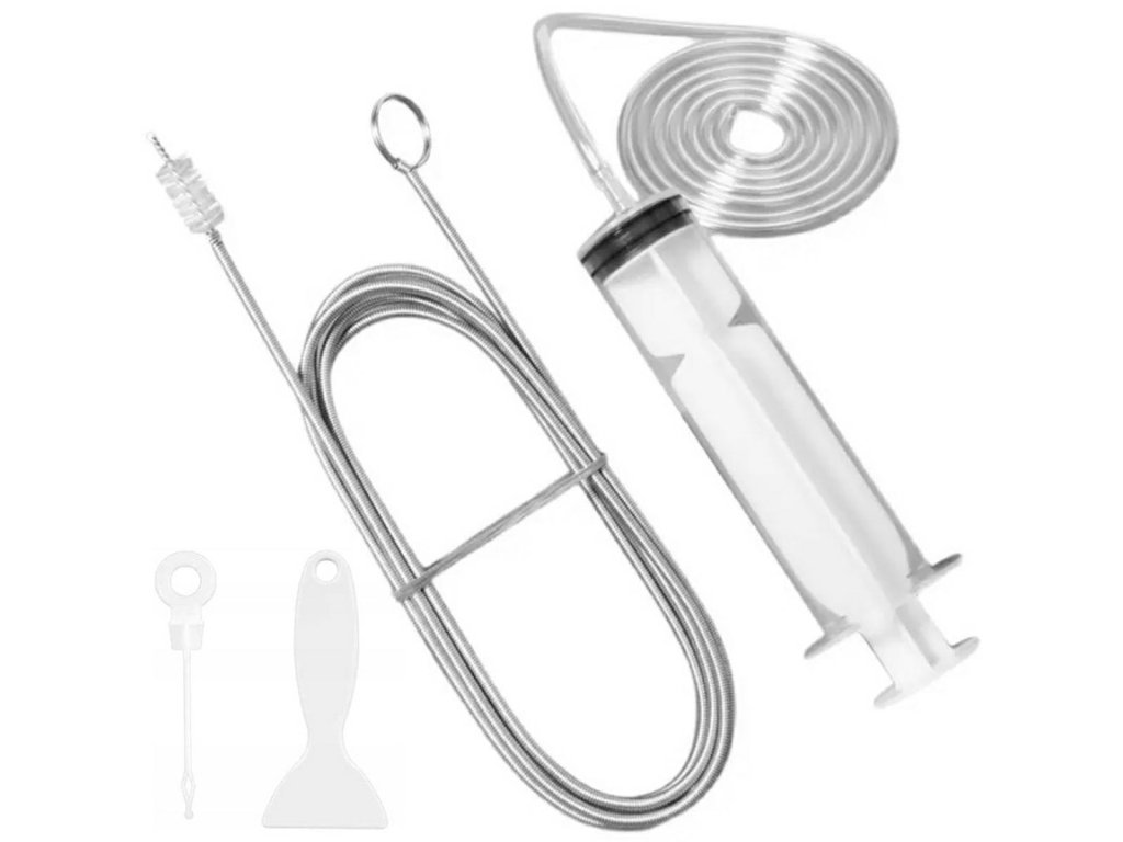 - Sada obsahuje nástroje jako dlouhý čisticí kartáč, stříkačku s hadičkou, jehlu na čištění otvorů a škrabku.
