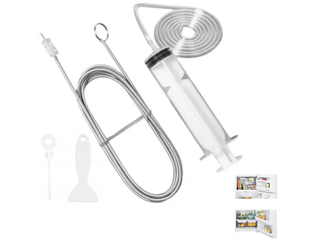 Multifunkční sada pro čištění a údržbu lednice. Sada obsahuje nástroje jako dlouhý čisticí kartáč, stříkačku s hadičkou, jehlu na čištění otvorů a škrabku. Díky tomuto produktu se postaráte o svou ledničku a prodloužíte její životnost. Je ideální pro čištění odtokových otvorů nebo seškrábání nečistot ze zdí.