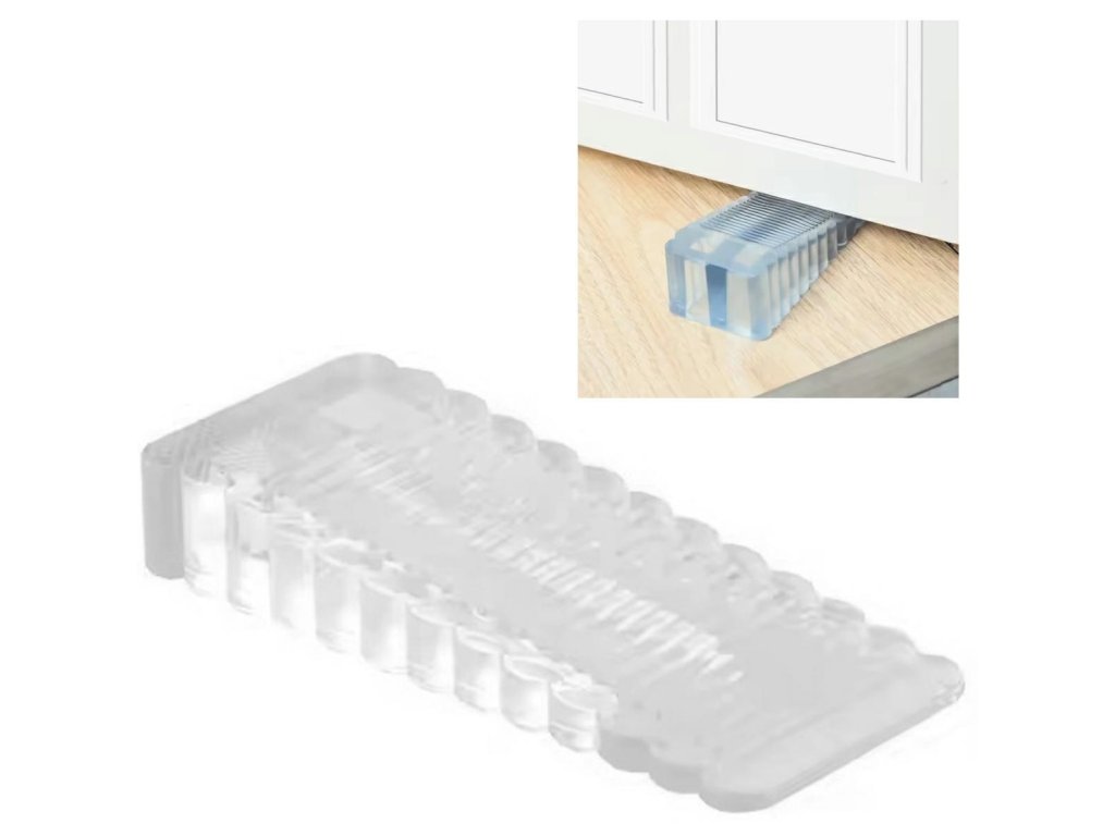 Transparentní klín zajišťující dveře proti otevření/zavření. Dokonale chrání stěny a dveřní křídlo před náhodným poškozením a poškozením. Omezovač je vyroben z roztažitelného silikonu, který dobře zapadá do mezery pod dvířky. Protiskluzová úprava zabraňuje klouzání klínu po podlaze. Průhledná barva je nenápadná.