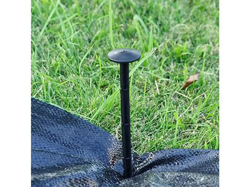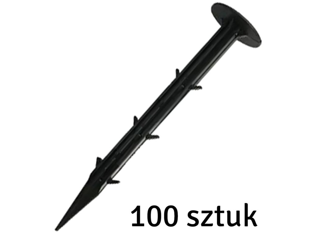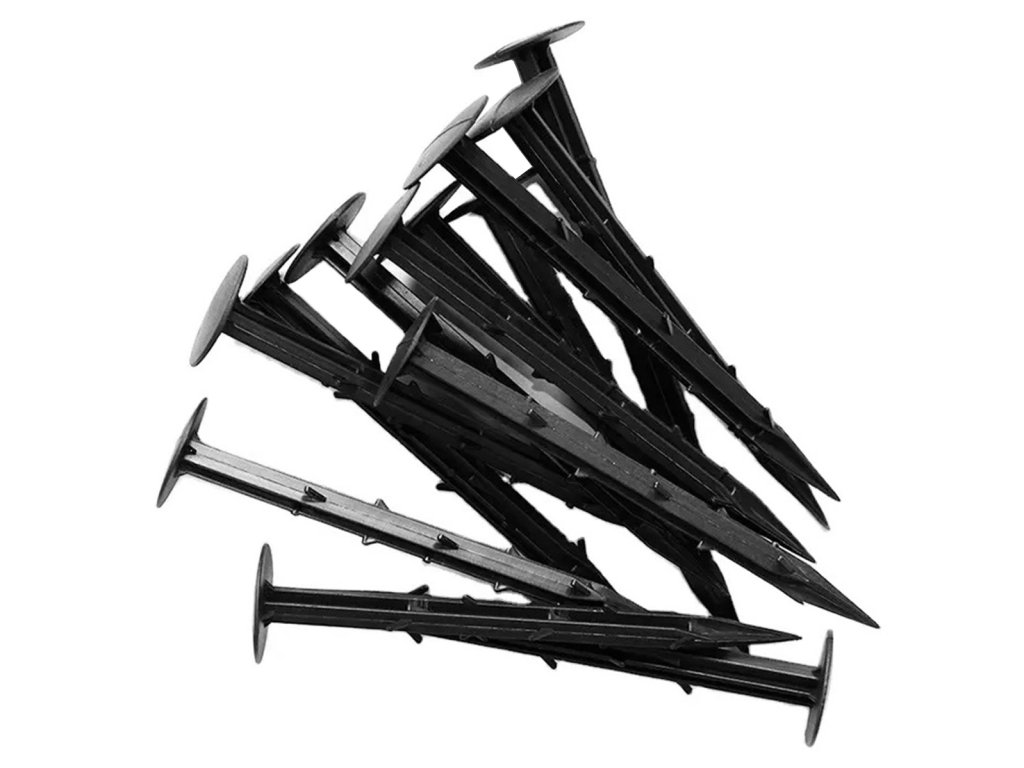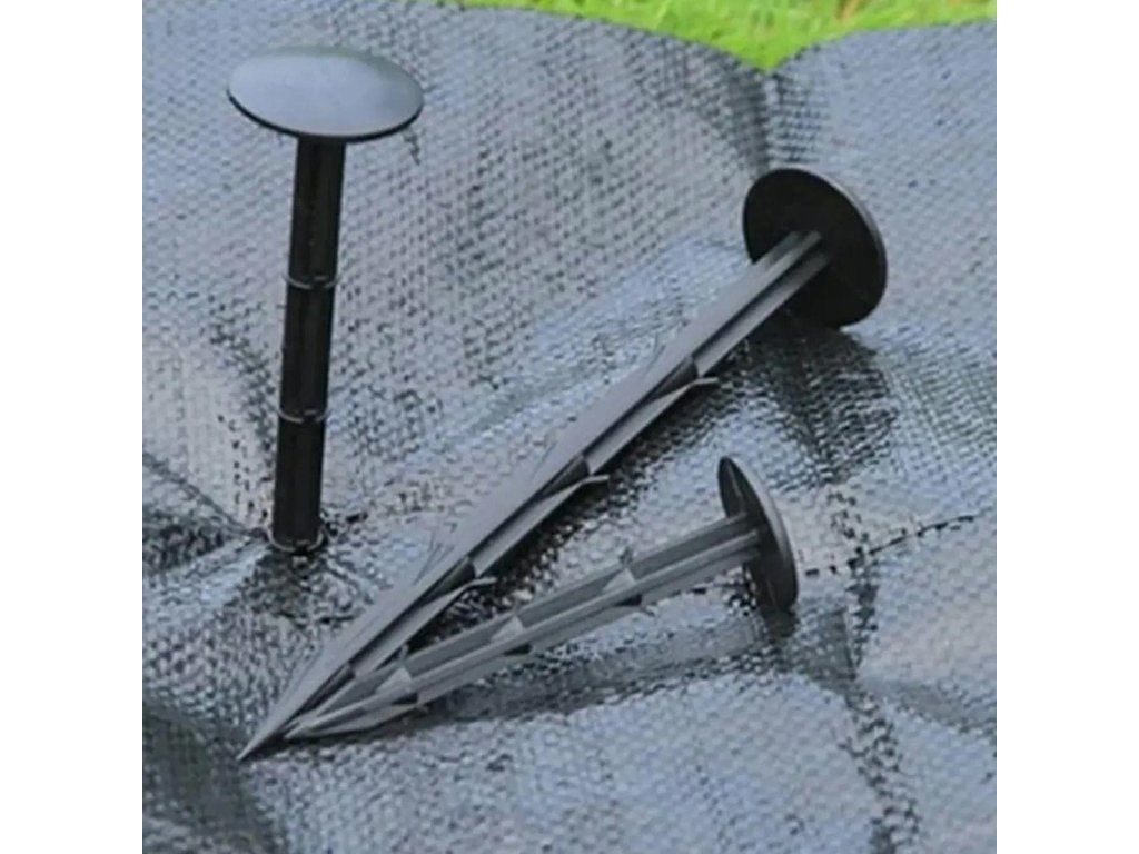 Sada 100 kotevních kolíků pro agrotextilie. Kolíky výrazně usnadňují připevnění textilie k zemi. Zoubkovaný design s ostrou špičkou dokonale proniká do půdy. Široká montážní hlava umožňuje rychlé zasunutí kotvy. Vyrobeny z plastu, zvyšují odolnost při kontaktu se zemí.