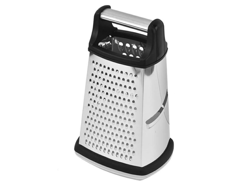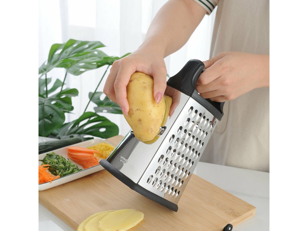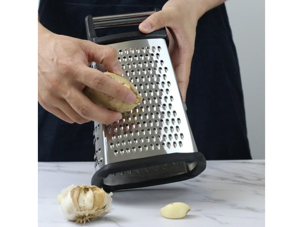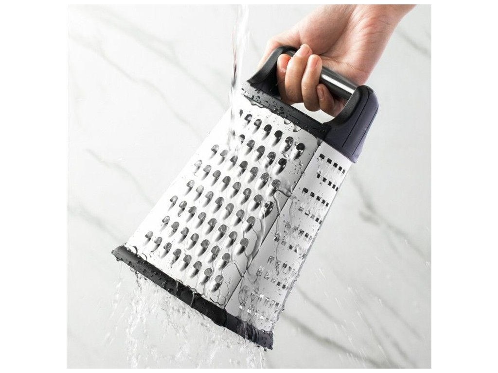 Robustní ocelové kuchyňské struhadlo. Vybaveno čtyřmi různými typy čepelí na každé straně. Pohodlná rukojeť nahoře pomáhá udržet struhadlo na místě během práce. Protiskluzová spodní strana zabraňuje klouzání struhadla po pracovní desce.