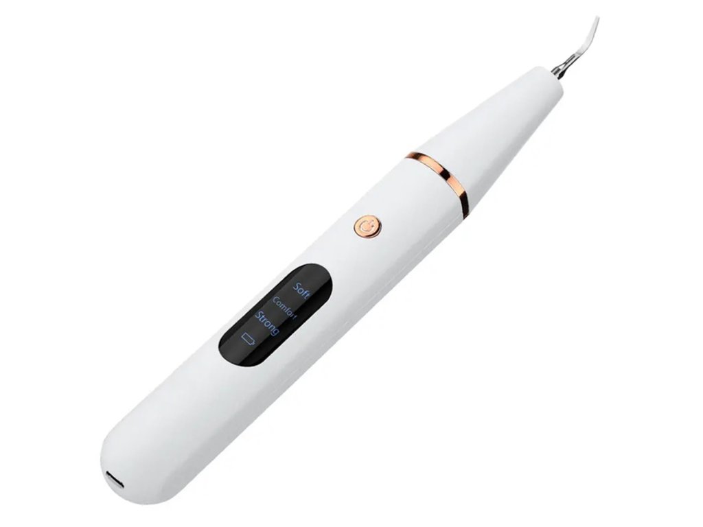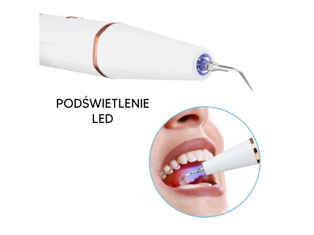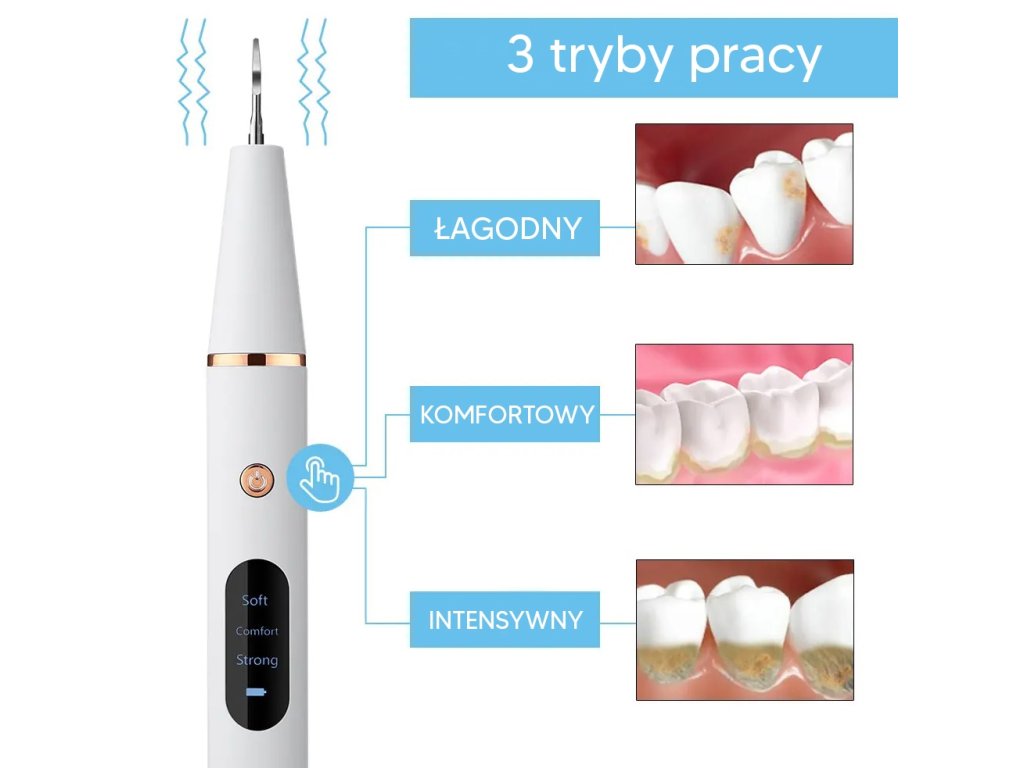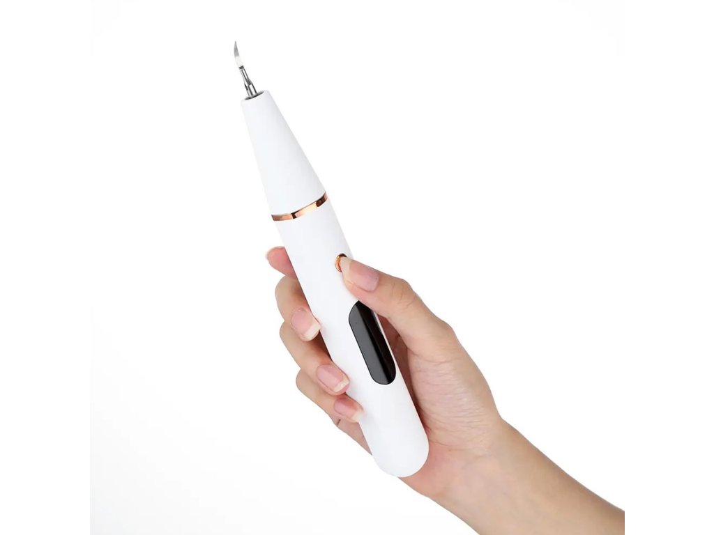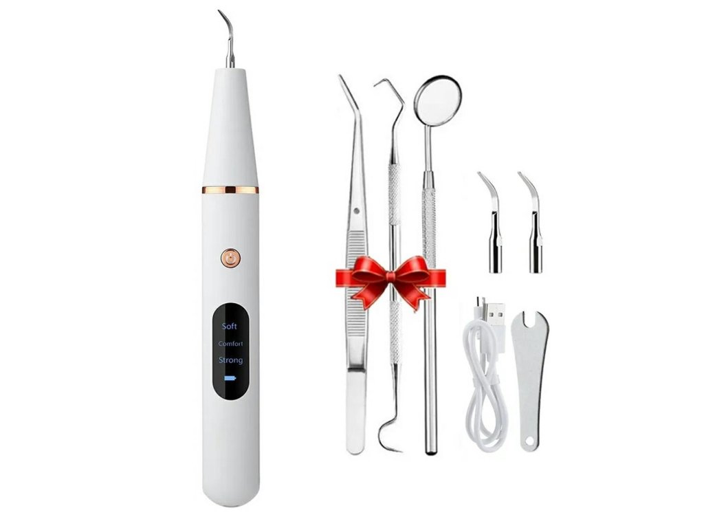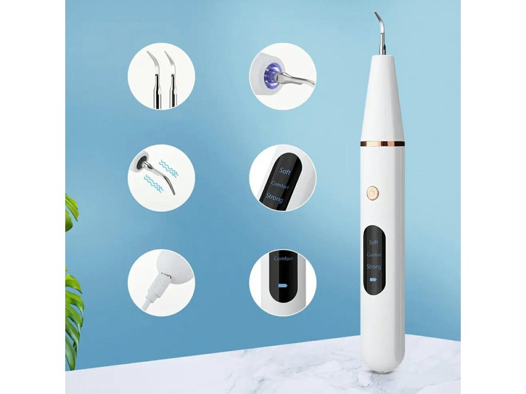 Ultrazvukový zubní odstraňovač zubního kamene sloužící k důkladnému čištění a odstranění zubního kamene ze zubů. Výrobek se doporučuje zejména lidem s nadměrným zubním kamenem, zubními protézami nebo ortodontickými rovnátky. Rozhodně usnadňuje péči o vaši ústní hygienu a účinně doplňuje standardní čištění zubů. Vybaven až 3 provozními režimy (měkký, pohodlný, silný) a 2 ocelovými hlavicemi pro různé části zubů. Lehký a kompaktní design a vestavěná baterie vám umožní vzít si zařízení na výlet. Sada obsahuje řadu doplňkového příslušenství (dentální sondu, zrcátko a škrabku).
