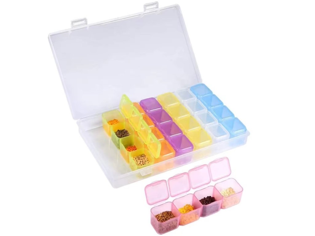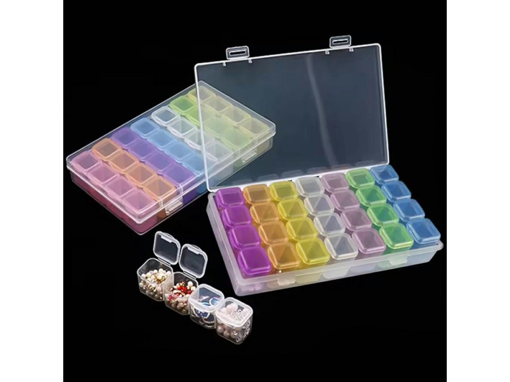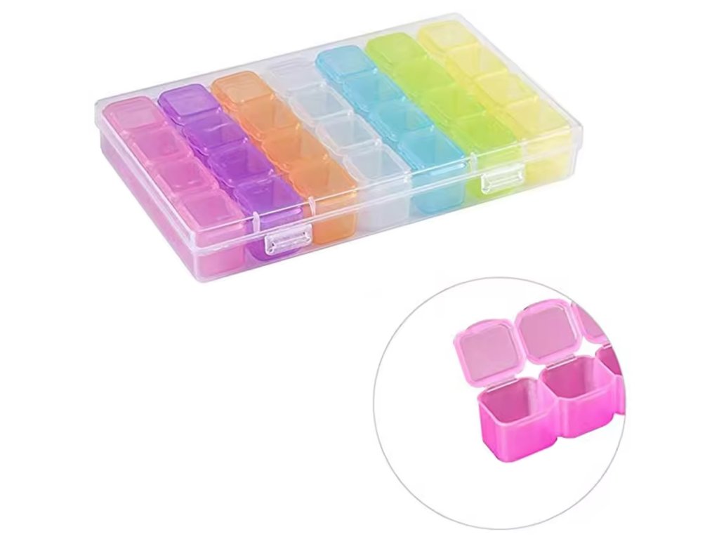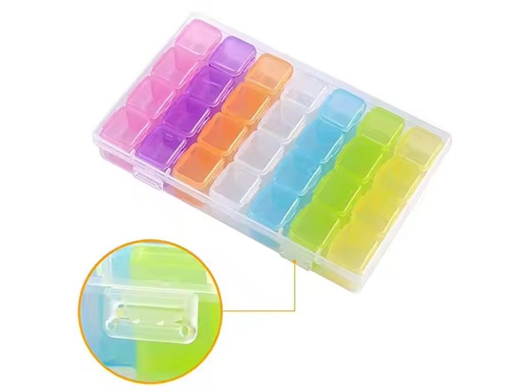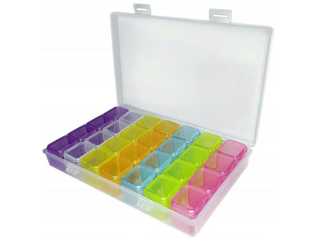 Nádoba na uložení krystalů pro vyšívání / diamantové malování. Vybavena až 28 přihrádkami v různých barvách a pevným zapínáním na klip. Pouzdro rozhodně usnadňuje skladování diamantů a eliminuje riziko jejich ztráty nebo vysypání.
