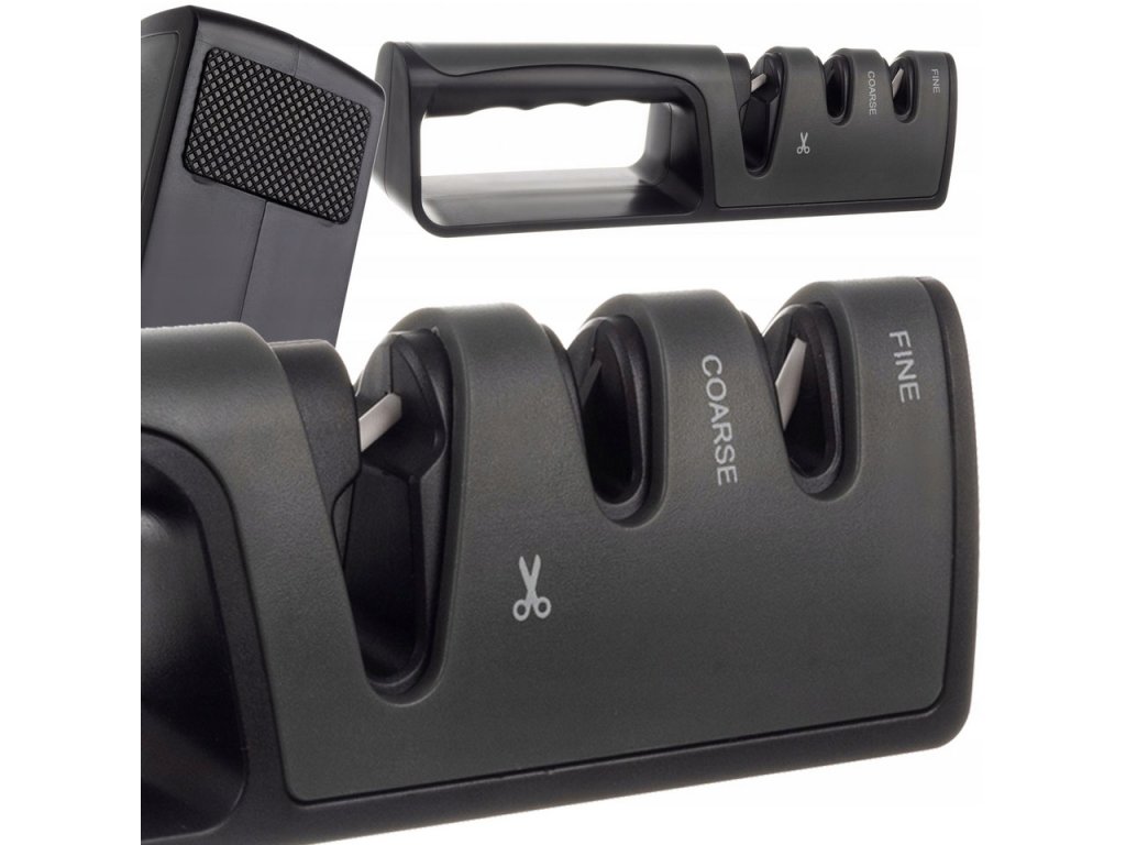 Tři stupně ostření nabízejí možnost nabrousit velmi tupé nebo poškozené hrany a nabrousit již tvarované čepele. Pro ostření nůžek a nožů s jedním břitem je k dispozici