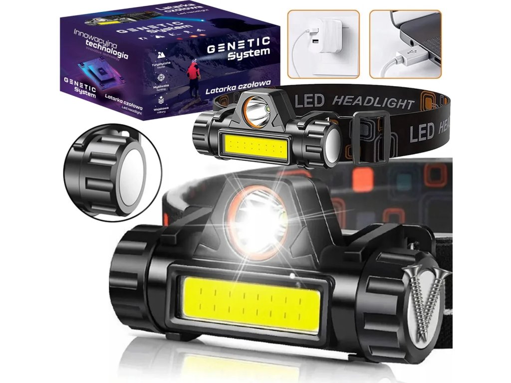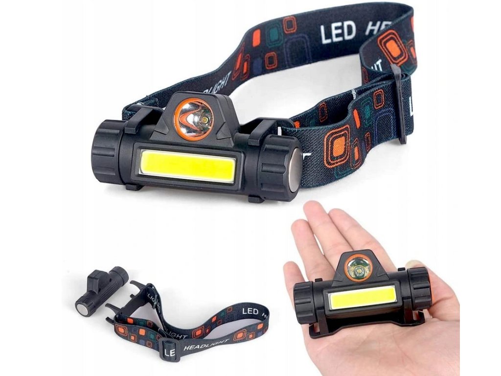 Světlomet COB 4v1 s magnetemČelovka se dvěma LED diodami (XPE + COB pásek) s USB nabíjením, magnetem, nastavitelným sklonem a popruhem.