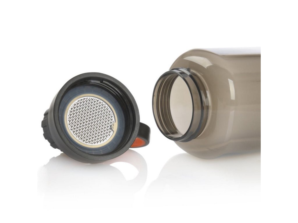 Láhev obsahuje filtr , který zadrží pevné částice z nápoje.