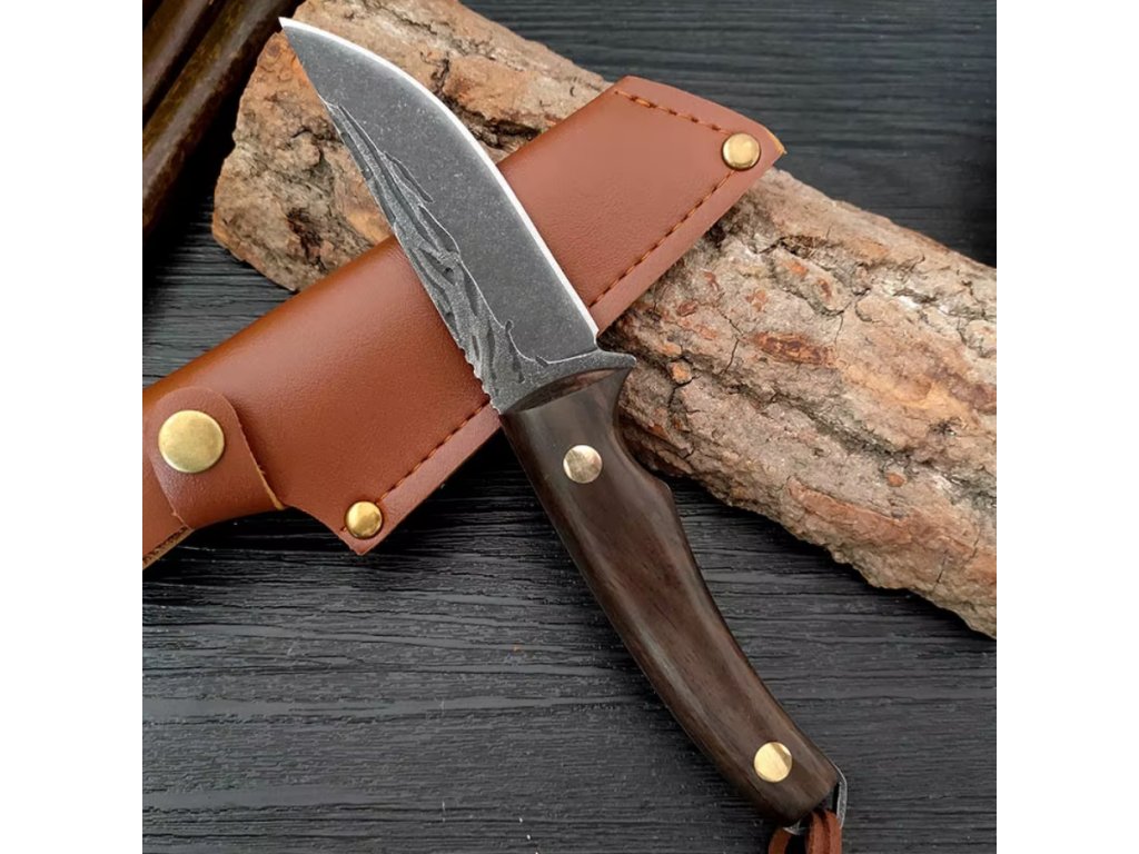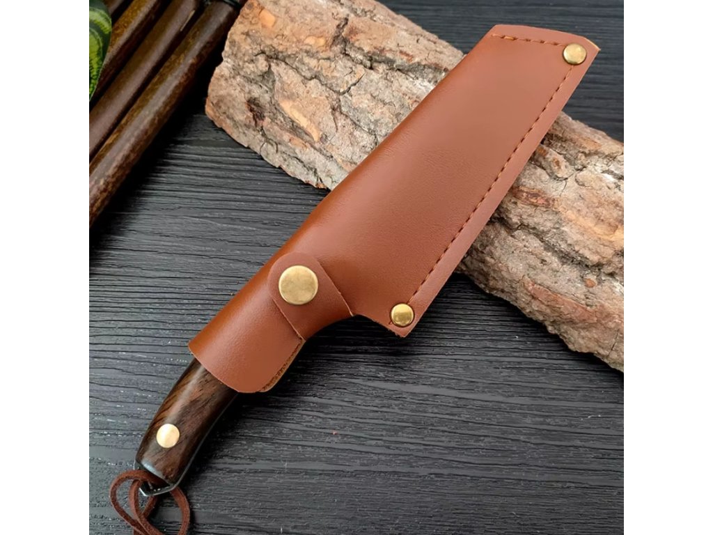 Lovecký nůž má hnědou pochvu , kterou lze připevnit na opasek nebo batoh.