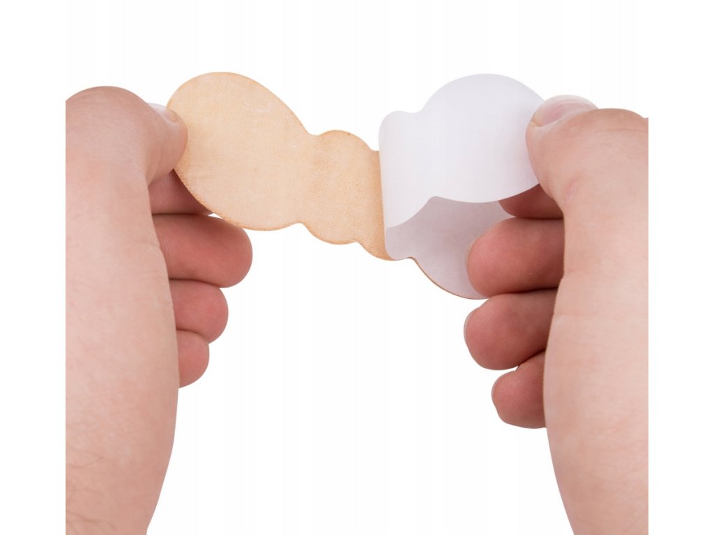 Zapiętki posiadają jedną stronę pokrytą klejem, dzięki czemu nie przesuwają się w bucie podczas chodzenia, wystarczy zerwać folię ochronną i umieścić zapiętki w tylnej części buta.