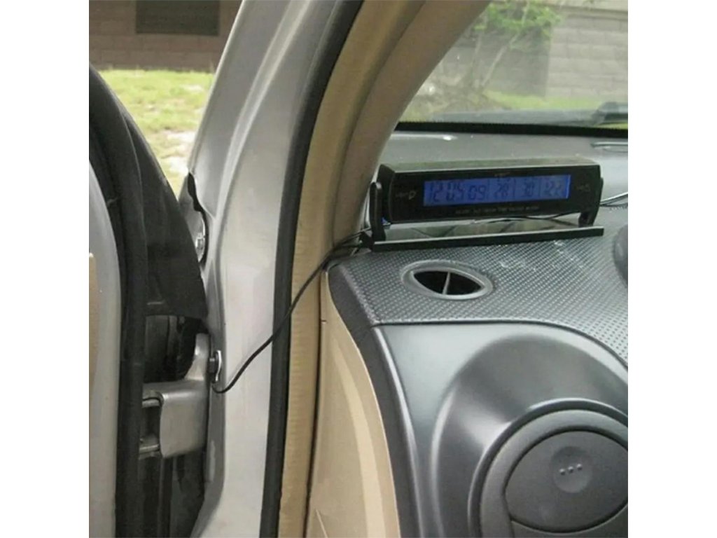 Elektronický teploměr do auta s hodinami a měřením úrovně nabití baterie. Teploměr má velký, přehledný LCD displej s podsvícením (napájený z 12V zásuvky autozapalovače), který současně zobrazuje teplotu ze dvou senzorů, čas a napětí baterie. Dlouhý kabel s vodotěsným senzorem venkovní teploty umožňuje umístění senzoru přímo pod přední nárazník, což zajišťuje nejlepší měření venkovní teploty při jízdě i stání. Možnost změny formátu zobrazení času (12 nebo 24) a jednotky teploty (C / F). Sada obsahuje silnou, oboustrannou lepicí pásku pro snadné připevnění teploměru k čalounění auta.