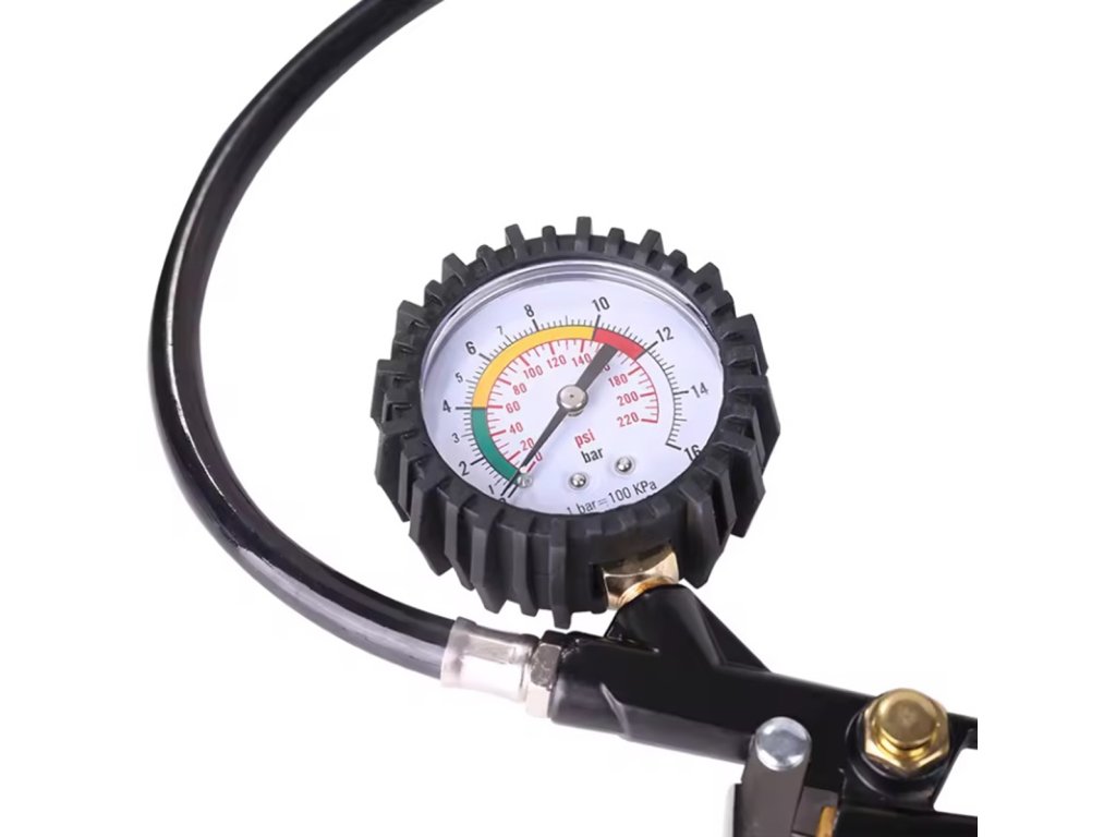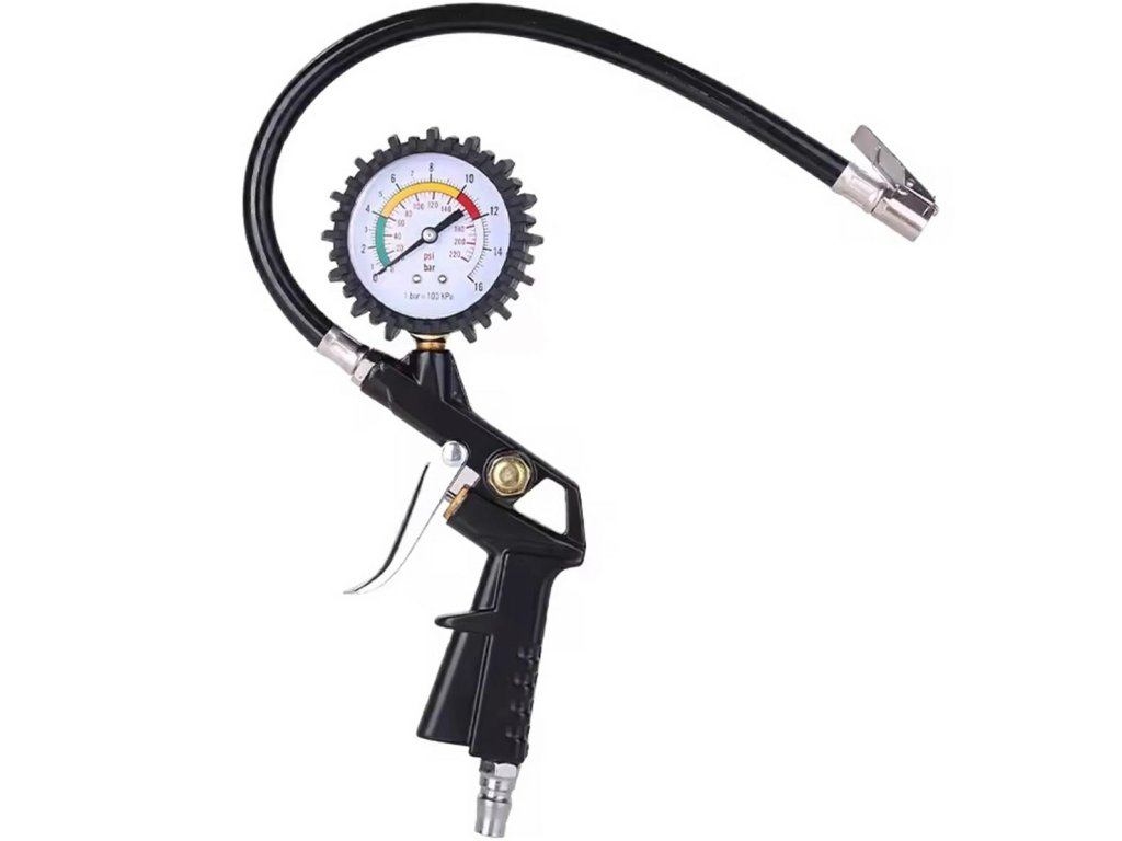 Kompaktní pneumatická pistole pro huštění pneumatik. Jednoduchá konstrukce přístroje usnadňuje práci a přehledný indikátor (tlakoměr) umožňuje zobrazit aktuální tlak ve více jednotkách současně (PSI / BAR). Pohodlná, flexibilní hadice se standardním ventilem zajišťuje pohodlné ovládání zařízení.