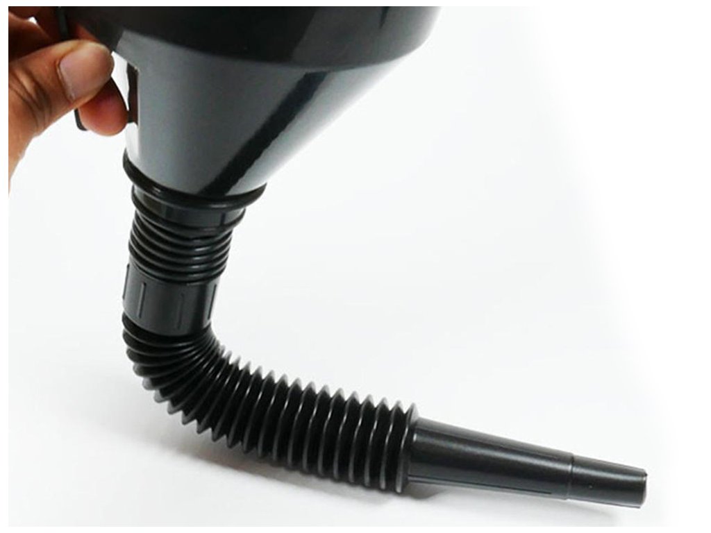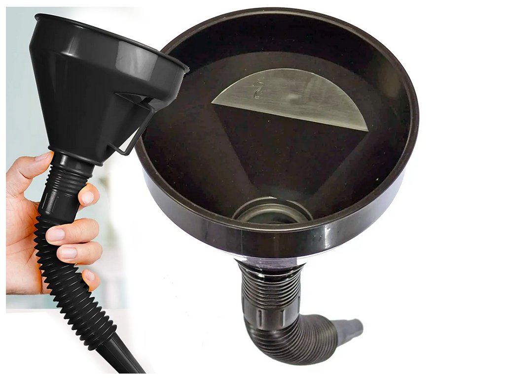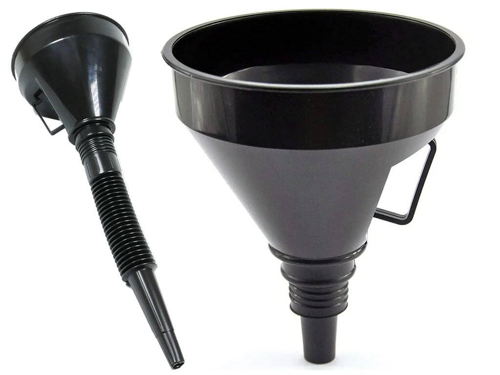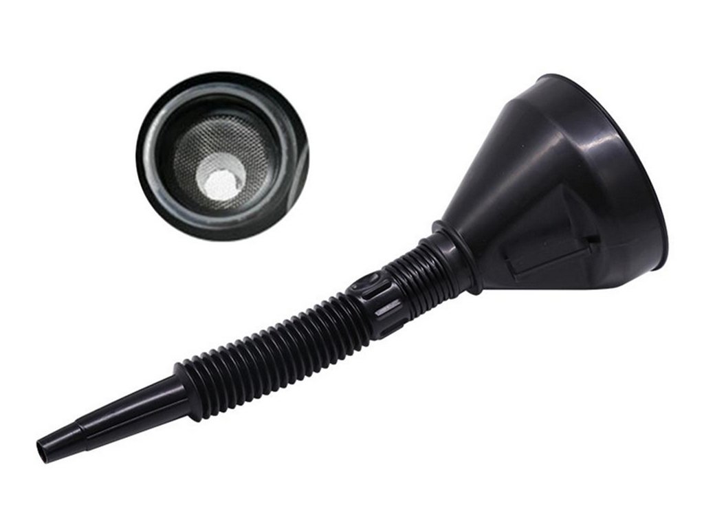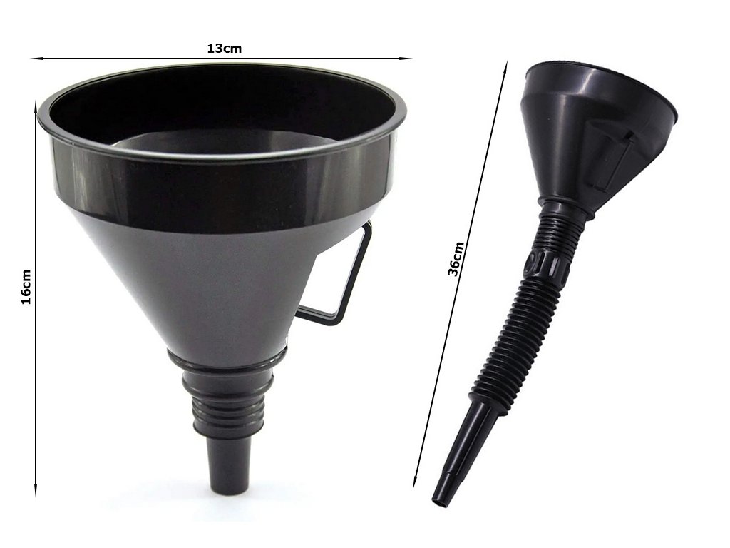 Nálevka je vyrobena z materiálů odolných vůči škodlivým chemikáliím. Trychtýř je rozebíratelný na dvě části. Lze jej používat samostatně nebo s harmonikovým nástavcem, který usnadňuje přesné nalévání kapalin. Nálevka je vybavena jemným sítkem, které zadrží jemné nečistoty, jako je písek, piliny apod.