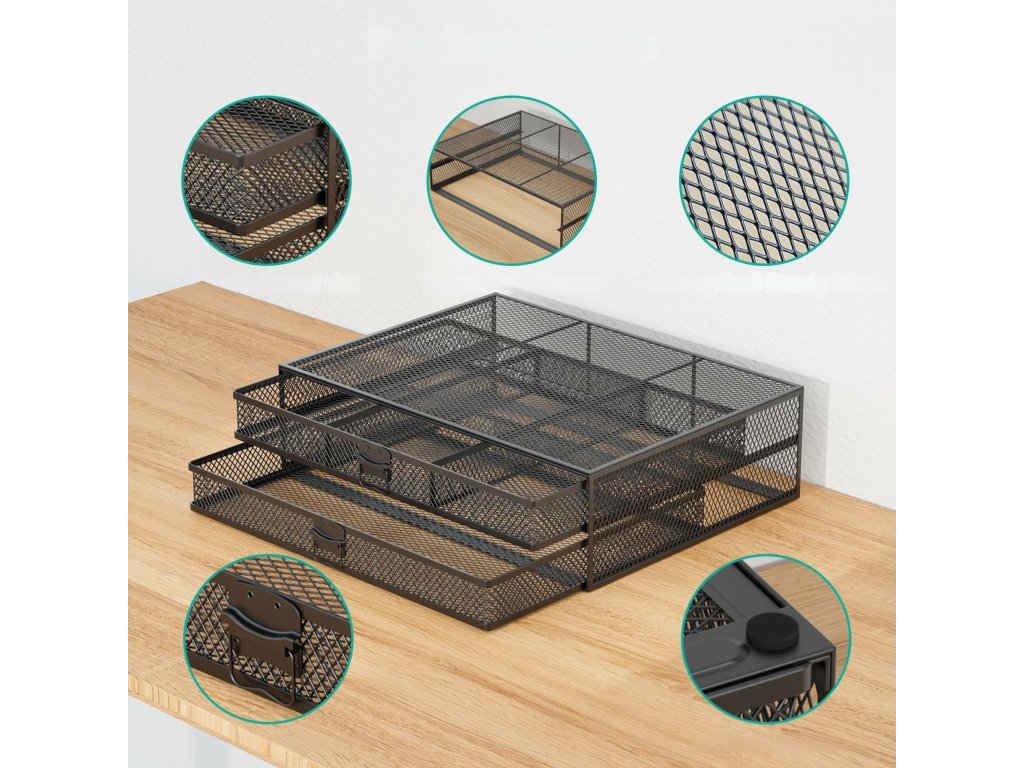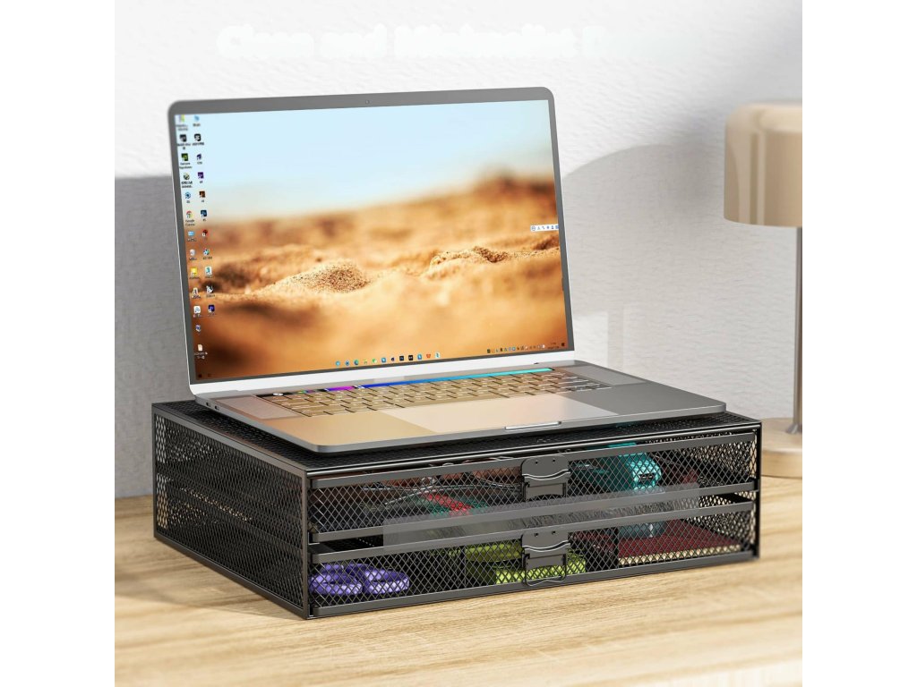 Kovový stolní stojan určený pro monitory, notebooky nebo malé televizory. Je vybaven dvěma zásuvkami pro uložení kancelářského příslušenství a síťovaná konstrukce zajišťuje dostatečné větrání vašich zařízení. Protiskluzové nožičky stabilizují stojan na pracovní desce.