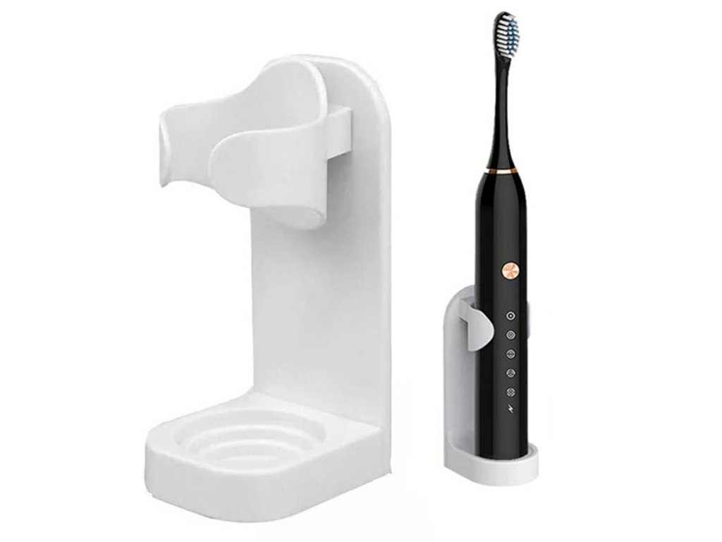 Univerzální nástěnný držák pro uložení elektrického zubního kartáčku. Závěs má rukojeť nahoře a základnu s prohlubní, které zajišťují stabilní uchycení zubního kartáčku. Otvor v základně zaručuje správné větrání a zabraňuje hromadění vody po čištění zubů.