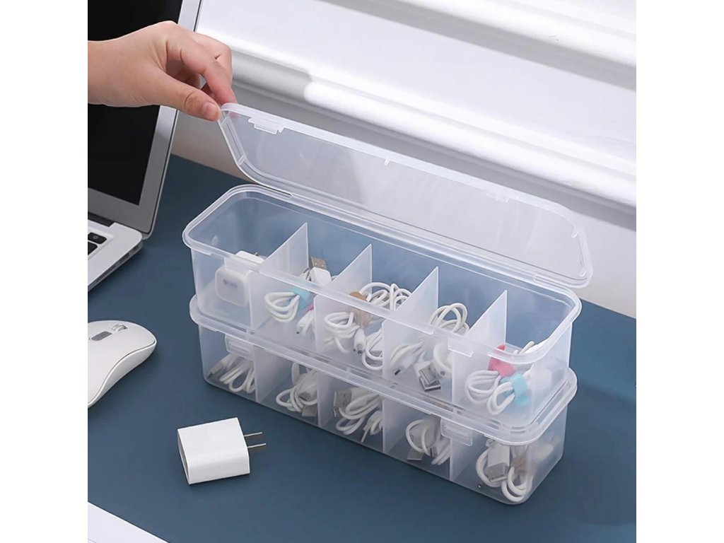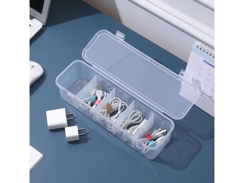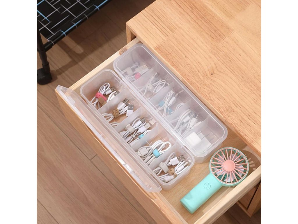 Velmi praktický organizér kabelů. Umožňuje skrýt kabely a malé datové nosiče (např. pero) a chránit je před přístupem dětí. Kromě bezpečnostních aspektů je to skvělý způsob, jak uspořádat rozptýlené kabely. Krabice má těsně uzavřené víko a pět samostatných oddílů pro usnadnění oddělení kabelů.