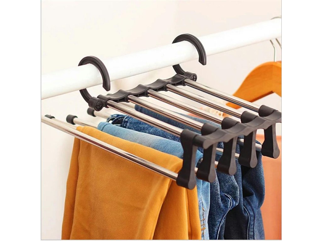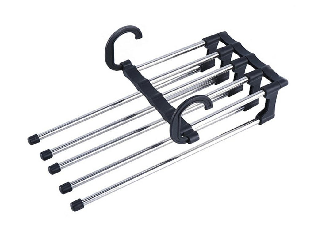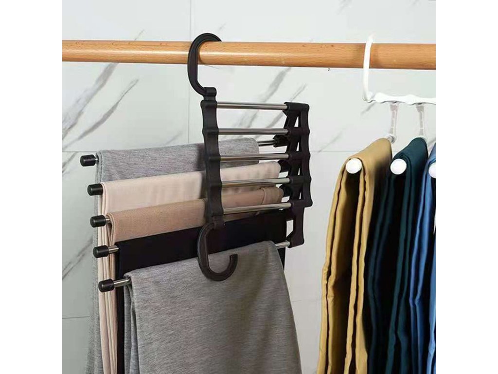 Praktický ramínko na kalhoty, které se snadno vejde do každé skříně. Má pět výsuvných, nastavitelných ramen, která usnadňují zavěšení kalhot. Snadná instalace – jednoduše jej zavěste do skříně na jeden nebo dva háčky jako tradiční věšák na kabáty. Pomáhá udržovat pořádek ve skříni. Lze jej také zavěsit vodorovně.