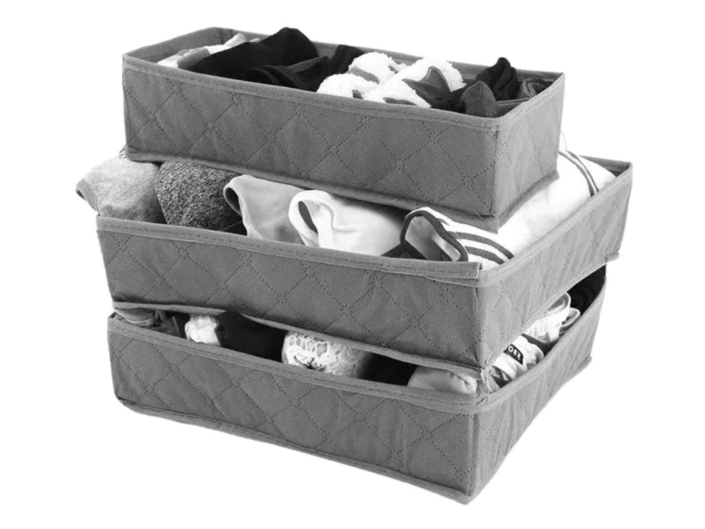 Sada 3 zásuvkových organizérů. Vložky poskytují jednoduchý, praktický a levný způsob, jak uspořádat vaši sbírku kravat, ponožek, opasků a spodního prádla. Sada obsahuje tři organizéry různých velikostí, počtu přihrádek a použití. Jsou vyrobeny z pevného, prodyšného materiálu. Otevřený design umožňuje rychlý přístup k oblečení. Skládací funkce umožňuje dodatečnou úsporu místa, když nepoužíváte jednu z vložek.