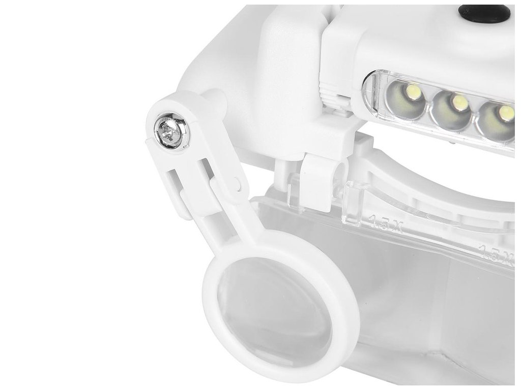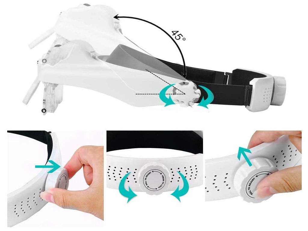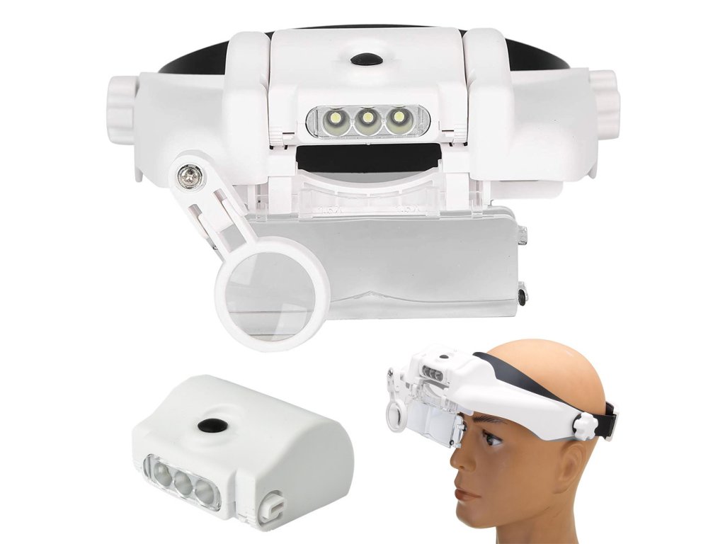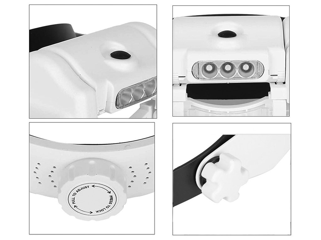 LED diody lze podle potřeby nastavit v úhlu sklonu. Celý mechanismus je založen v podobě hledí na hlavě. Stínítko lze naklápět nahoru nebo dolů. Lupa má univerzální velikost, protože je vybavena popruhem, který je plně nastavitelný pomocí knoflíku. Umožňuje pracovat i při nošení korekčních brýlí.