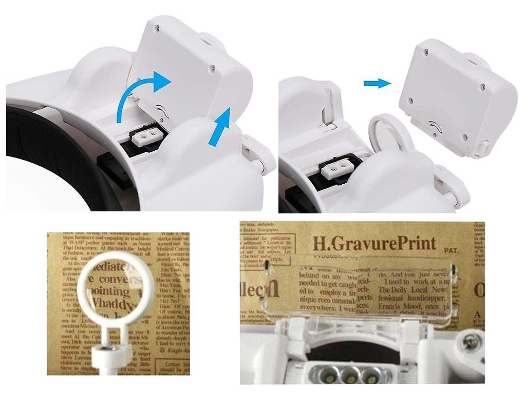 Profesionální náhlavní lupa s různými čočkami, zvětšení 1x 1,5x 2x 2,5x 3,5x je ideální zařízení pro každodenní použití. Mohou ji používat klenotníci, numismatici, servisní technici elektroniky, hodináři atd.