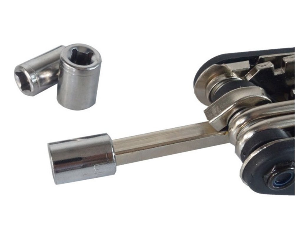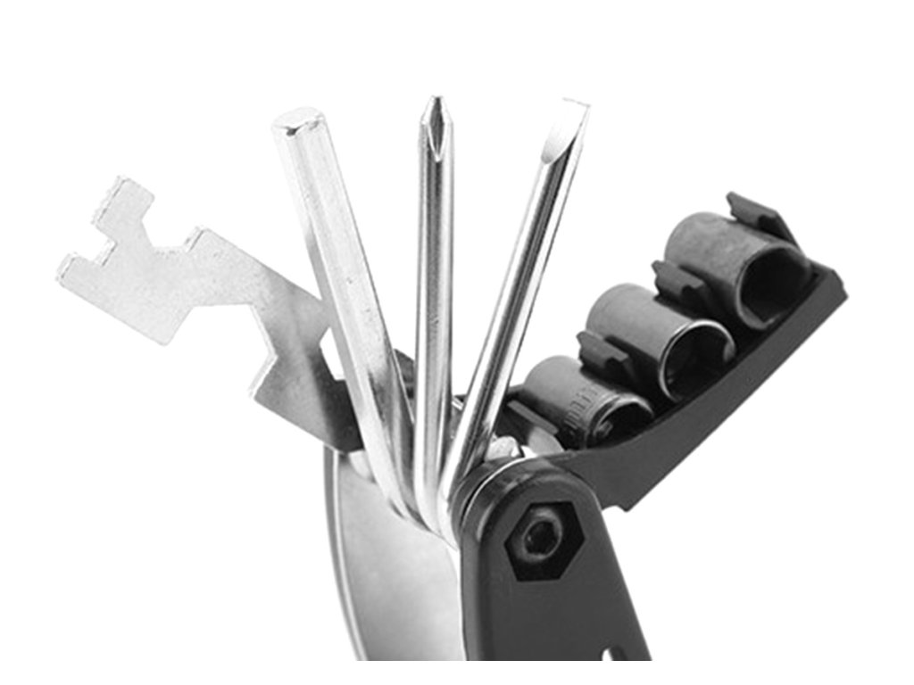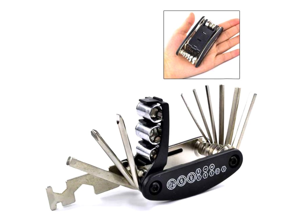 Sada klíčů na kolo! Velmi praktická a prostorově nenáročná vychytávka pro každého vášnivého cyklistu. Od nynějška můžete provádět jakoukoli drobnou opravu jízdního kola na silnici, aniž byste museli nosit asi tucet nářadí zvlášť! Sada obsahuje 16 nářadí pro údržbu jízdních kol a drobné opravy. Celá věc byla uzavřena v praktickém a kompaktním kapesním noži. Po složení padne snadno do ruky, snadno se skladuje a v tašce na kolo nebo kufru nezabere mnoho místa. Sada obsahuje imbusové klíče, šroubováky, zásuvky s adaptérem, vidlicové klíče a speciální 14GE klíč na paprsky.