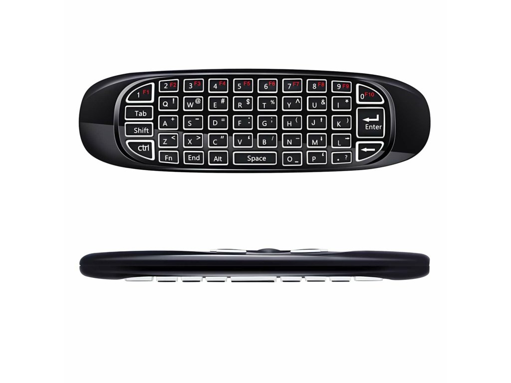 Toto bezdrátové dálkové ovládání kombinuje funkce dálkového ovladače, myši a klávesnice a poskytuje tak kompletní ovládání multimediálních zařízení až do vzdálenosti 10 metrů. Díky funkci Air Mouse můžete pohybovat kurzorem ve vzduchu pouhým mávnutím ruky, aniž byste museli používat stůl nebo kuchyňskou linku. Standardní rozložení klávesnice QWERTY umožňuje pohodlné psaní a ergonomický a lehký design perfektně padne do ruky. Dálkové ovládání je připraveno k použití ihned po připojení USB přijímače – nejsou potřeba žádné ovladače ani další software.