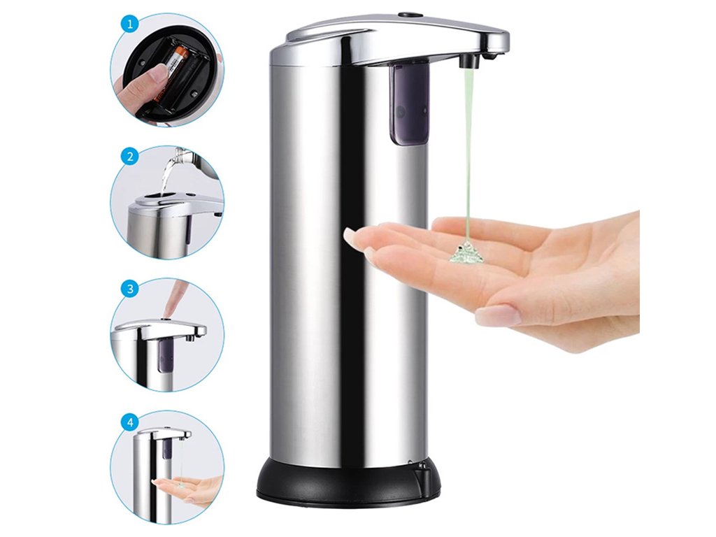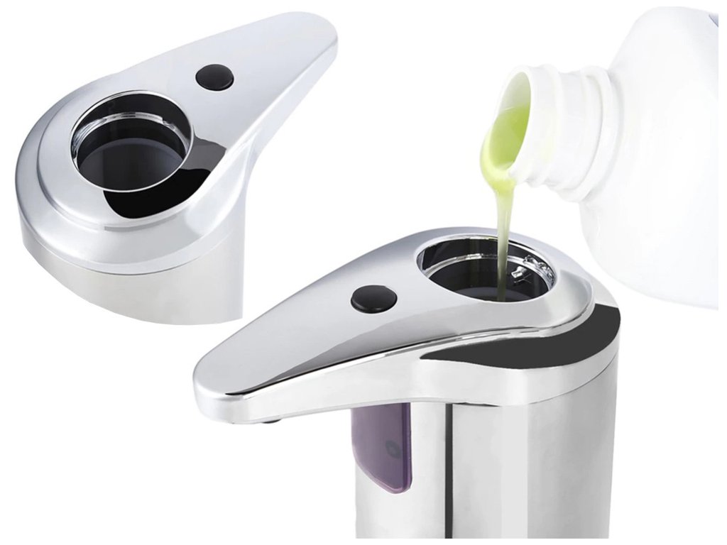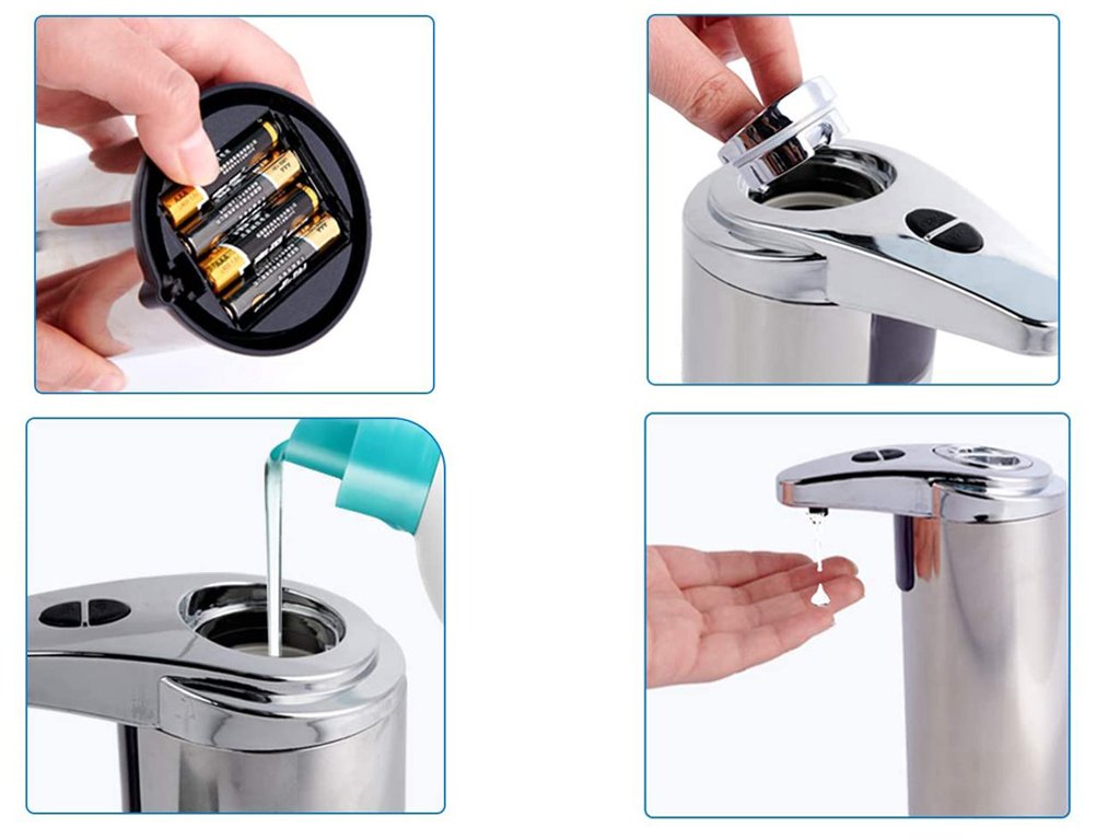 Chcete-li dávkovač používat, stiskněte na delší dobu tlačítko zapnutí, a pokud jej chcete vypnout, proveďte totéž tlačítkem vypnutí. Dávkovač je napájen čtyřmi bateriemi AAA. Dávkovač lze použít také na dezinfekční prostředky na ruce. Bezkontaktní systém mimořádně užitečný v dnešní době, aby se zabránilo co nejvíce bakteriím.