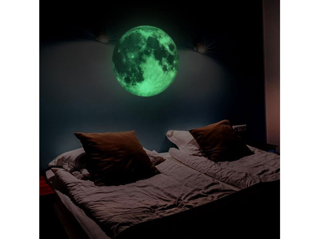 Svítící samolepka na zeď ve tvaru Měsíce o průměru 30 cm. Večer po zhasnutí světel se ve tmě samolepka rozzáří – fluoreskuje. Krásný designový prvek do dětského pokoje, obývacího pokoje nebo do ložnice. Samolepku lze nalepit na všechny hladké povrchy jako jsou kachličky,tapety, zeď, sklo, nábytek, lednice apod.