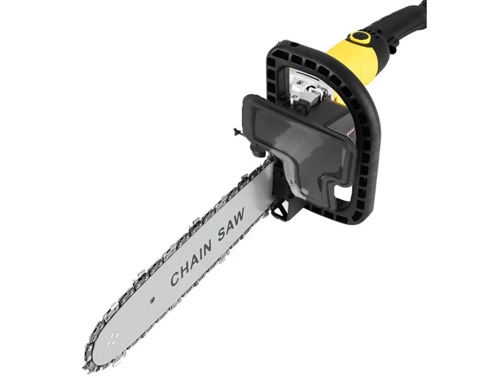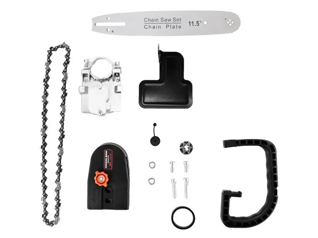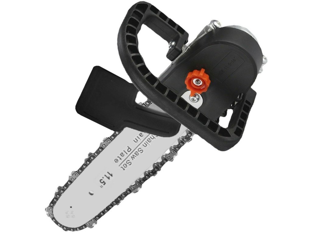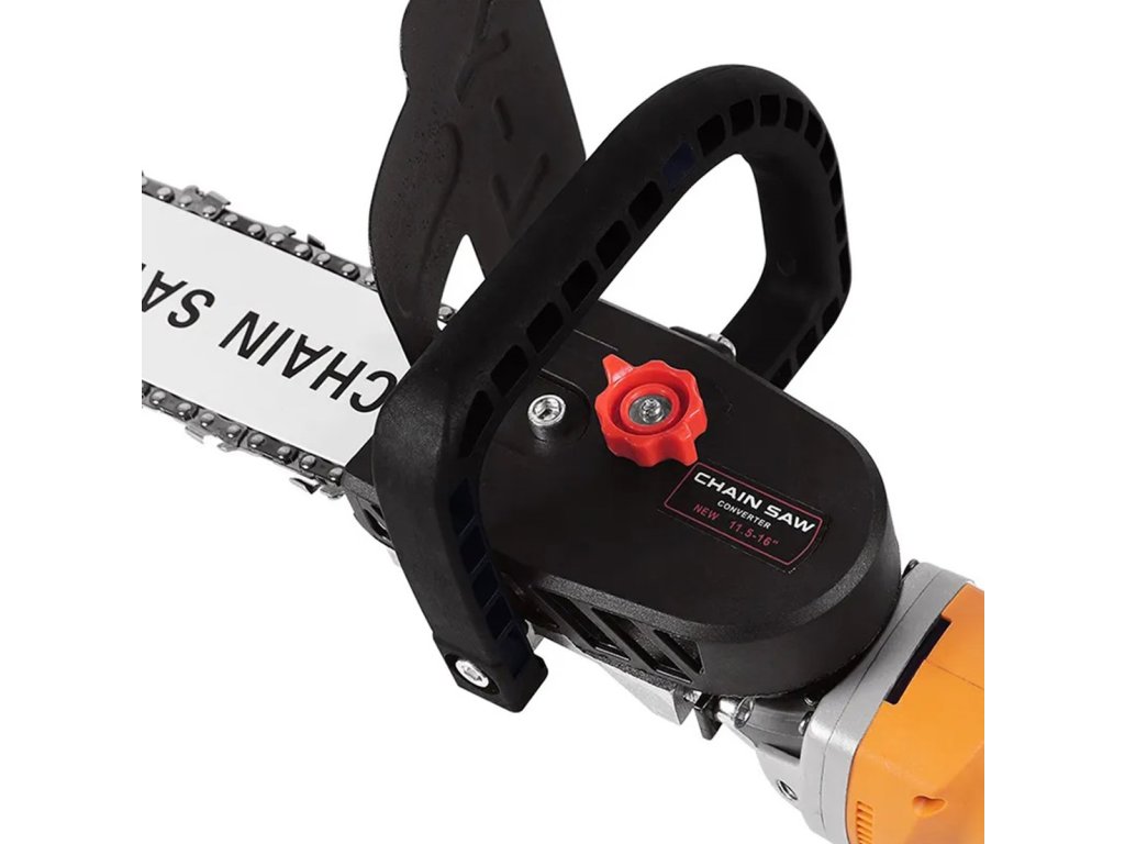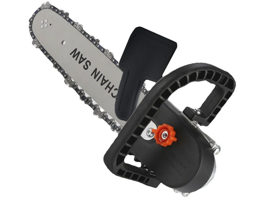 Nástavec na úhlovou brusku - řetězová pila. Mimořádně praktická vychytávka, která z vaší brusky udělá šikovnou motorovou pilu. Převodník se montuje do objímky brusky jako klasický kotouč. Pohodlná, zaoblená rukojeť zajišťuje vysoký komfort práce. Speciální kryt za řetězem zvyšuje bezpečnost při používání.