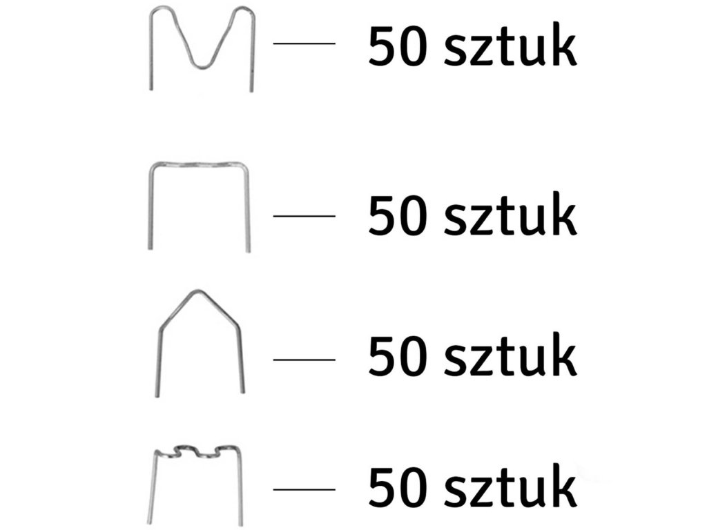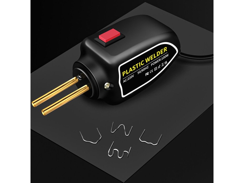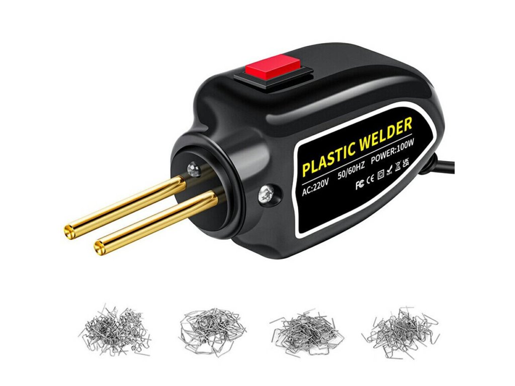 Kompaktní svářečka plastů. Sada obsahuje 200 ocelových spon na plast (4 druhy, každá po 50 kusech).