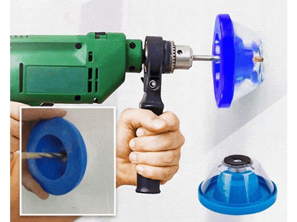 Nádoba na prach (lapač prachu) pro příklepové vrtačky. Vynikající způsob, jak se vyhnout nadměrné prašnosti při renovačních pracích. Stačí vložit vrták (o průměru 4 až 10 mm) otvorem uvnitř nádoby a začít vrtat do stěny. Průhledný kryt sběrače prachu umožňuje kontrolu jeho obsahu. Protiskluzová houba nahoře přesně přilne ke stěně a zabrání rozsypání prachu ven.