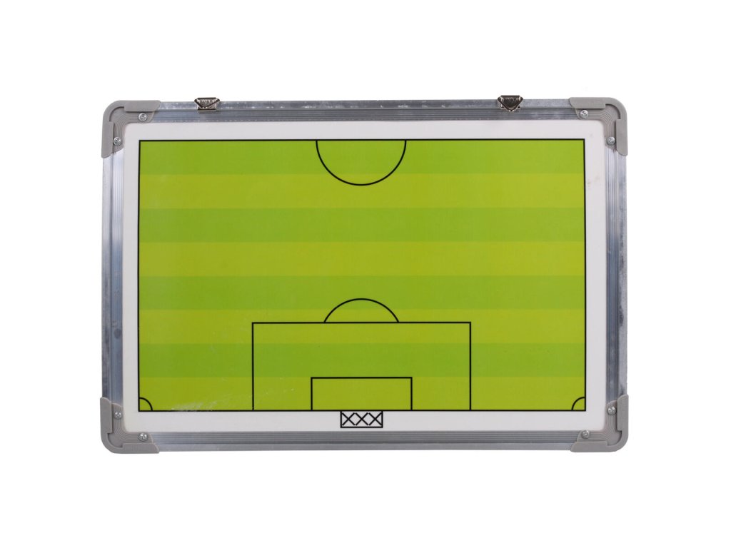 Trenérská tabule na fotbal je nezbytný doplněk každého fotbalového trenéra napříč všemi soutěžemi. Taktická fotbalová tabule Merco FOTBAL 40 je oboustranná magnetická deska s barevným provedením poloviny z jedné strany a z druhé strany celého fotbalového hřiště v hliníkovém rámu. Součástí fotbalové tabule Merco FOTBAL 40 je 28 magnetů (s motivy čísel, míče a rozhodčích), dva popisovače a stírací houbička. Závěsná trenérská tabule Merco FOTBAL 40 je ideální pomocník pro taktické porady ve fotbalové šatně.Doplňkové parametry