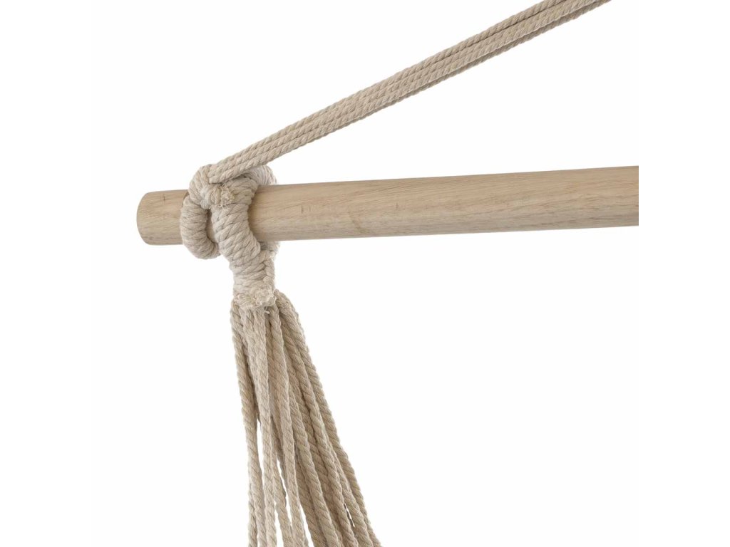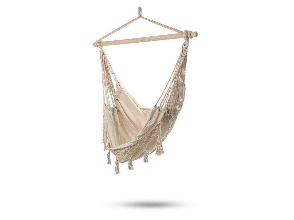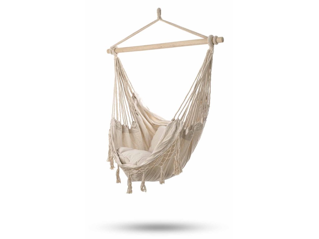 Závěsný kroužek je spojen s odolnými lany, rovnoměrně rozloženými po šířce houpacího křesla přes dřevěný příčník. Tato konstrukce umožňuje snadné zavěšení a houpací křeslo je dobře vyvážené a stabilní.