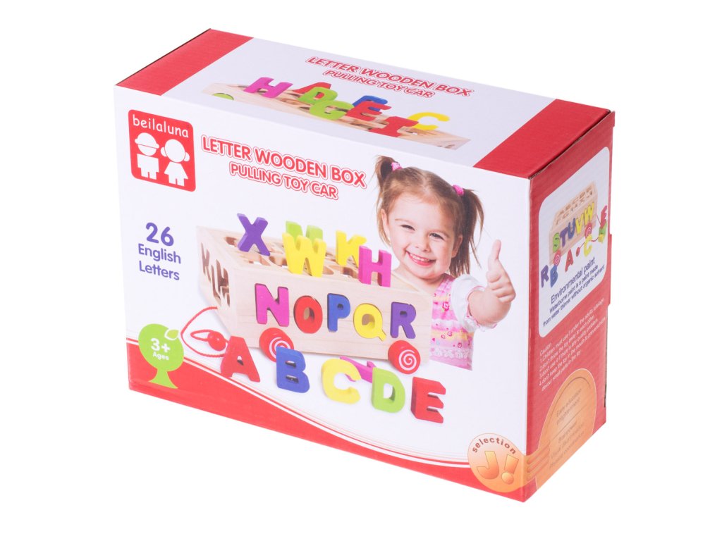 Dřevěná vkládačka na kolečkách obsahuje otvory na pěti stranách na vhazování přiložených barevných dřevěných písmen. Hráním se dítě naučí rozpoznávat tvary, naučí se všechna písmena abecedy a rozvine schopnost logicky myslet.