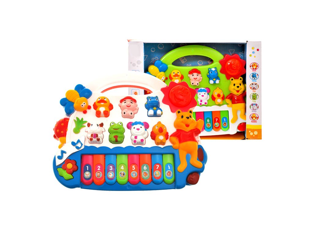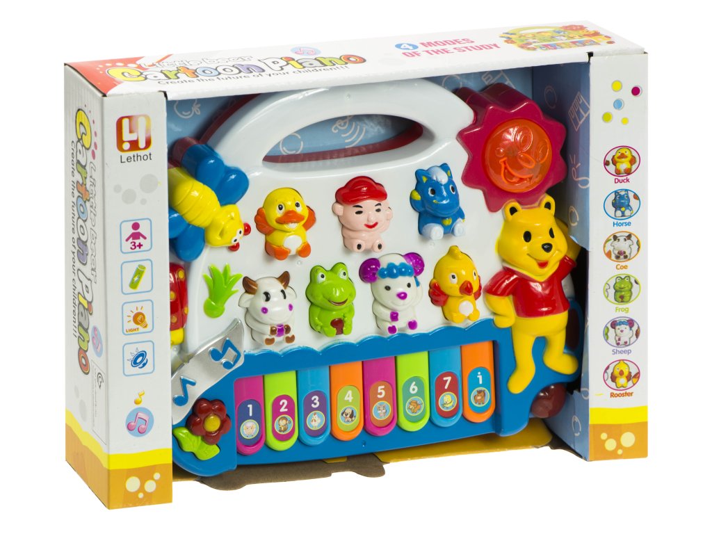 Interaktivní piánko se světelnými efekty. V závislosti na stisknutí tlačítka přehrává různé melodie nebo zvuky zvířátek.