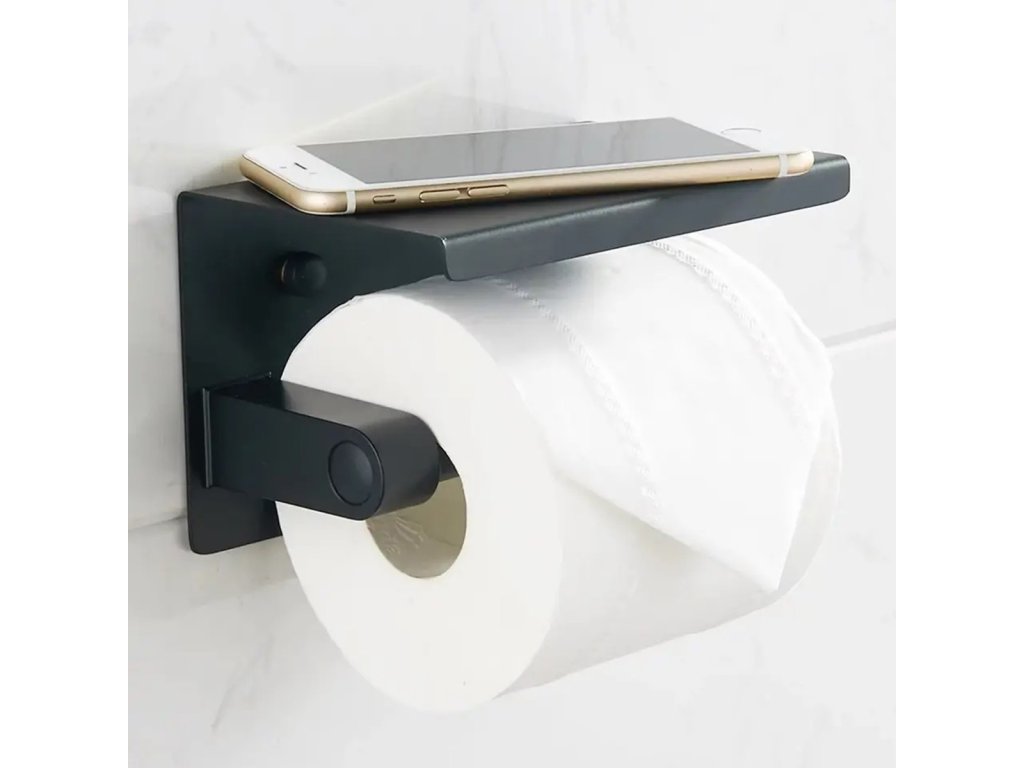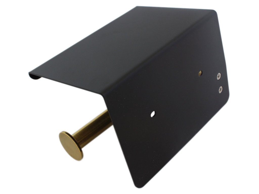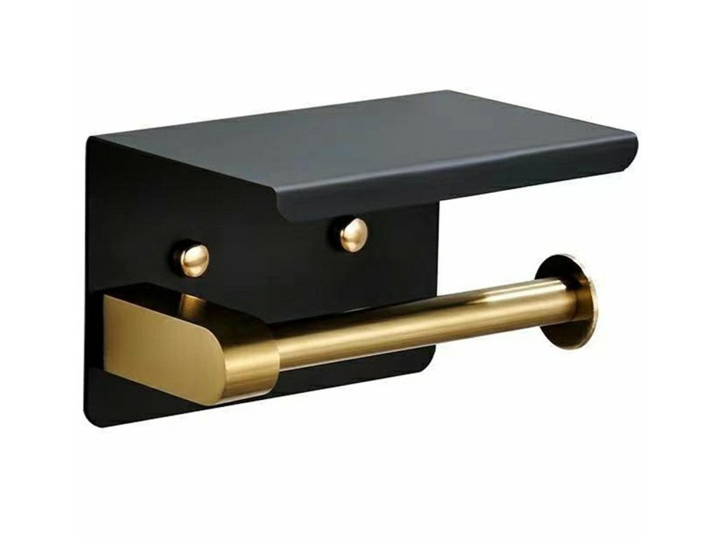 Černo-zlatý ocelový držák na toaletní papír v loftovém stylu. Vybaven přídavnou poličkou pro umístění telefonu nebo jiných drobných předmětů. Vyrobeno z masivní práškově lakované nerezové oceli (odolné vůči korozi). Snadná montáž pomocí přiložených montážních prvků (šrouby a podložky).