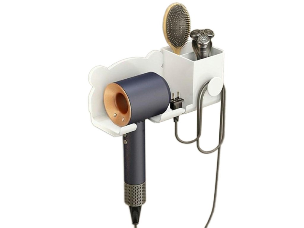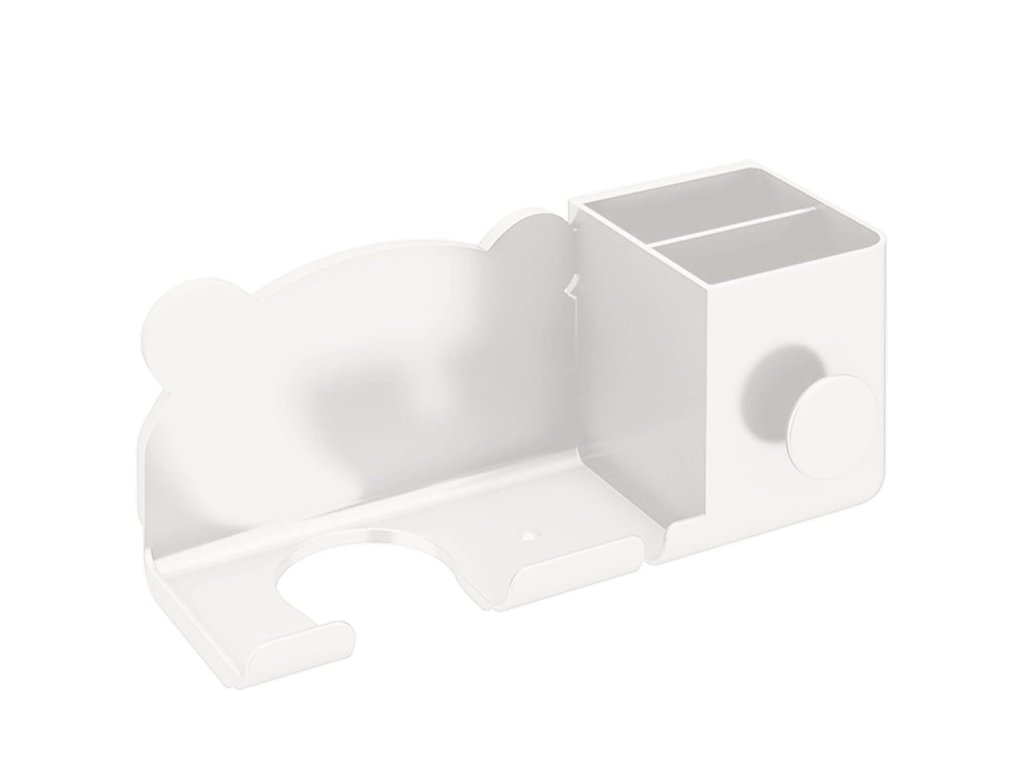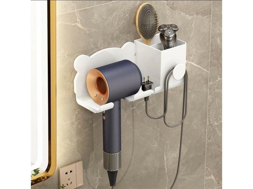 Nástěnný držák na vysoušeč vlasů. Velmi pohodlné řešení a velká úspora místa. Velmi snadná a neinvazivní instalace pomocí oboustranné pásky. Vybaven dvěma přihrádkami na drobnosti a přídavným háčkem na přední straně. Skvěle se bude hodit jako přídavná polička na kosmetiku nebo zubní kartáčky.