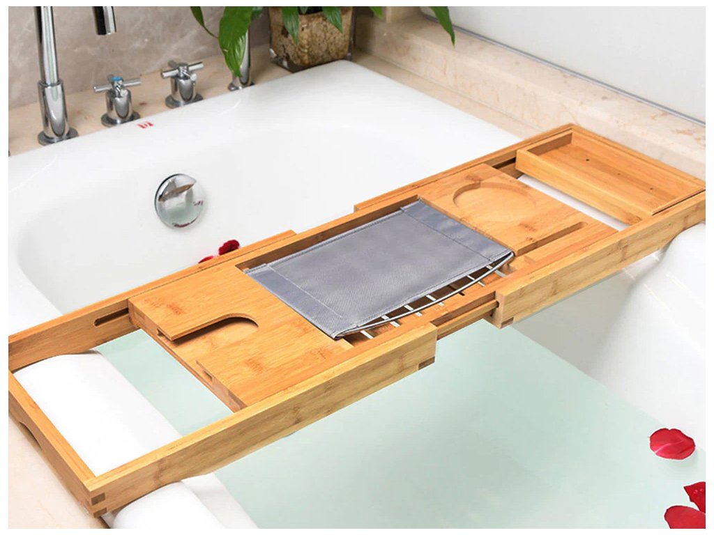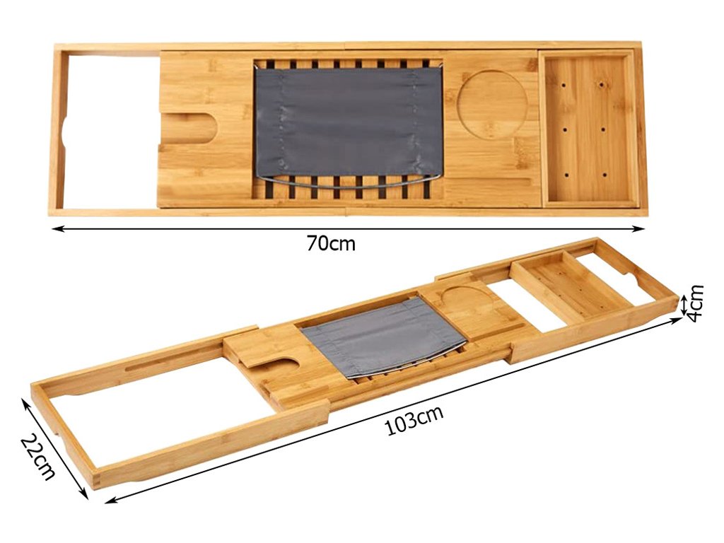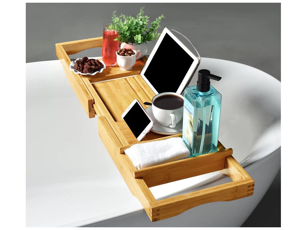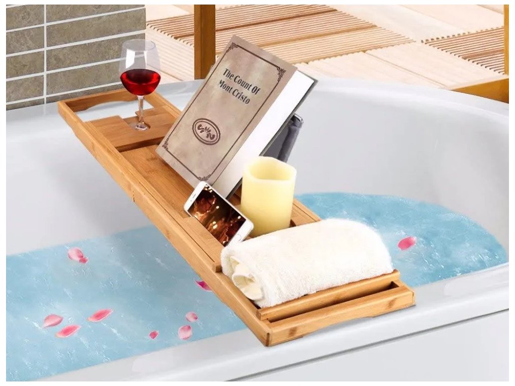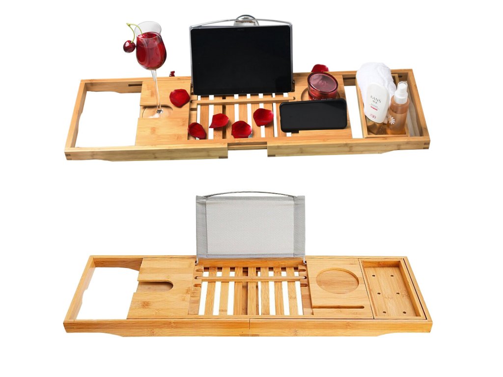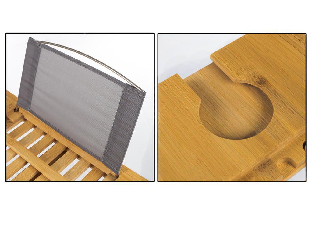 Tento vysoce kvalitní servírovací stolek, který je vyrobený z bambusu pro dokonalou relaxaci ve vaně s odkládací plochou, místem pro odkládání mýdla, výklopným stojánkem na knihu a držákem na skleničku na víno.
