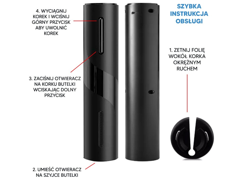 Elektrický, automatický otvírák na víno. Vývrtka se hodí pro většinu standardních lahví. Pevná konstrukce zajišťuje dlouhodobé používání. Napájení 4 AA bateriemi. Perfektní dárek pro každého více či méně pokročilého milovníka vína.