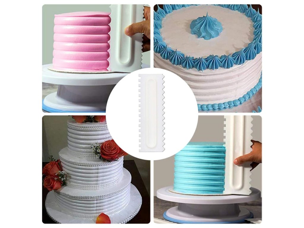 Vroubkovaná stěrka na zdobení dortů a dortů. Ideální pro zdobení cukrářských výrobků. Odlišný tvar zubů na obou stranách čepele rozhodně usnadňuje práci. Vyrobeno z pevného plastu, který zajišťuje dlouhé a bezproblémové používání.