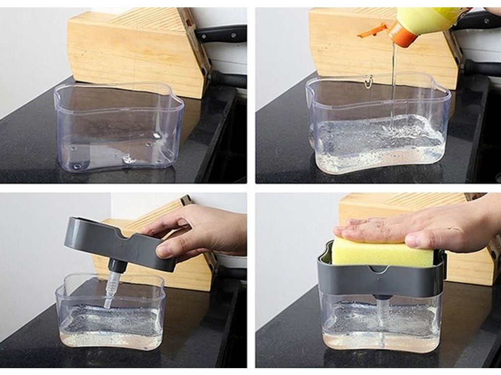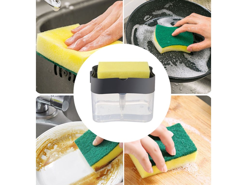 Praktický dávkovač tekutin jako je mýdlo nebo prostředek na mytí nádobí se bude hodit v každé kuchyni a koupelně. Dávkovač výrazně usnadňuje a urychluje dávkování správného množství tekutého mýdla nebo prostředku na mytí nádobí – stačí houbičku lehce přitlačit a část tekutiny houbičku nasákne.