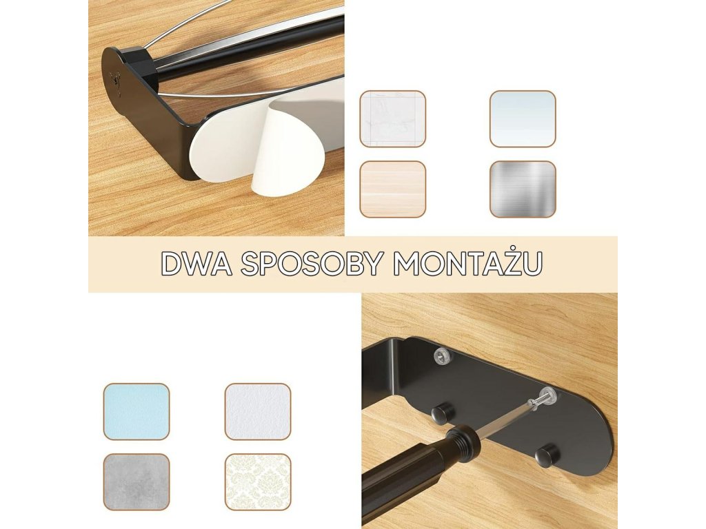 Pohodlný ocelový držák na papírové ručníky. Speciální konstrukce umožňuje pevné přilnutí ručníku a usnadňuje odtrhávání listů papíru. Určeno k montáži pod kuchyňskou skříňku nebo na zeď. Je ideální do úzkých kuchyní a šetří cenný prostor na pracovní desce. Dva způsoby montáže v závislosti na vašich potřebách. Pomocí lepicí pásky nebo šroubů a hmoždinek, které jsou součástí sady.
